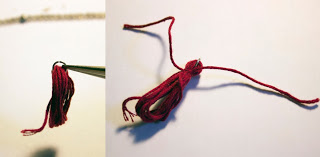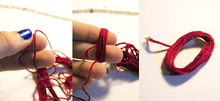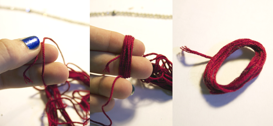 Step 3: Make a tassel. Take your embroidery floss, and wrap 9 times around your index and middle fingers. Cut the thread at the bottom of the wrap. Gently take off your fingers (do NOT wrap super-tight!)