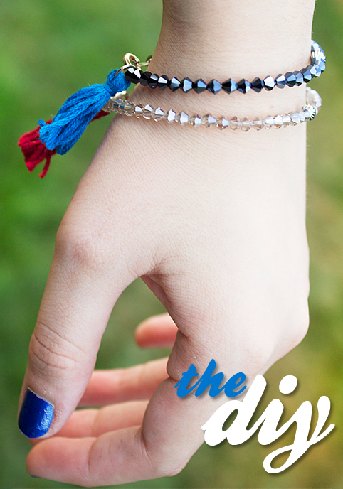 My tutorial will show you how to create bracelets inspired by these designs, and they actually come together super-quick! You can make a ton of these in no time at all. Stick with a solid color crystal and use the same color throughout the bracelet. For the tassel, use a contrasting color for a pop!