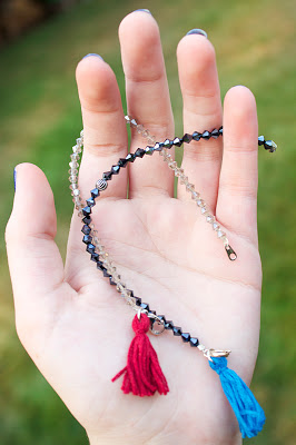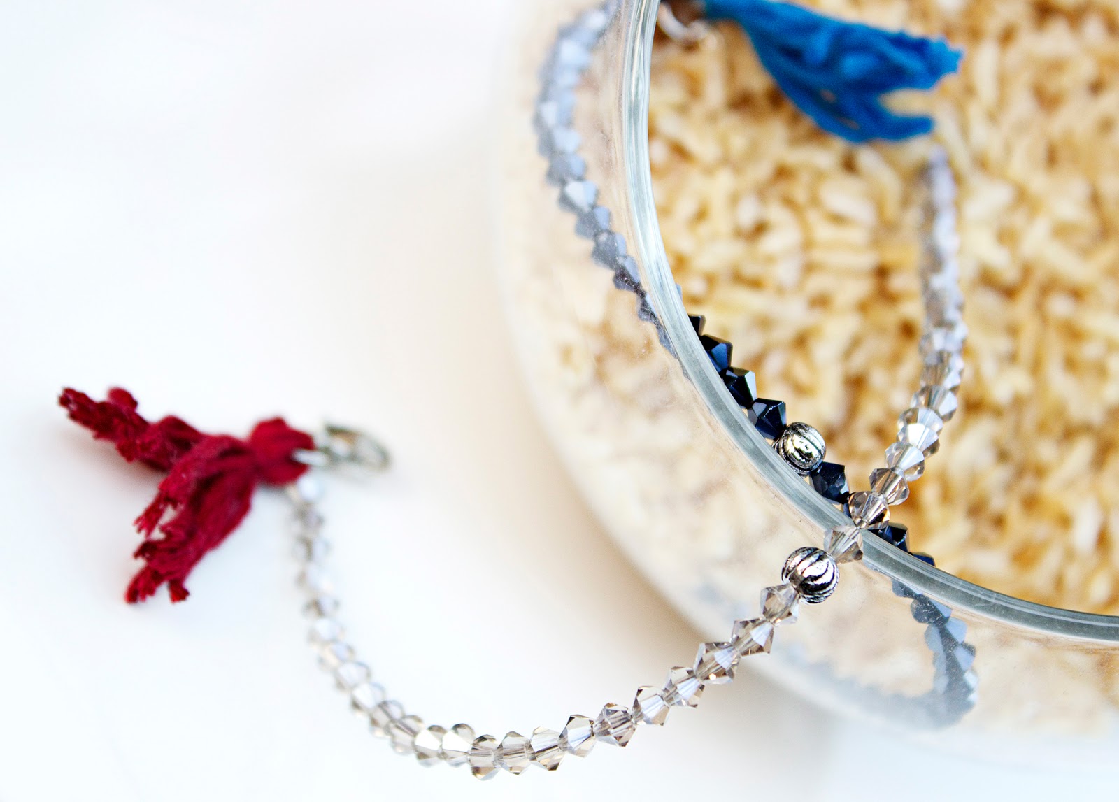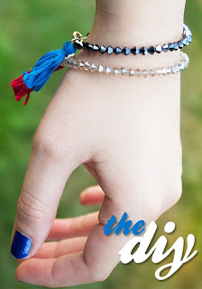 I kept the scheme sophisticated and cool; neutrals with a pop of red and blue! However, if you like brighter accessories, go Kate Spade on us try a combo of emerald crystals with watermelon-pink floss! Go nautical with a mix of red floss and blue crystals, with a white pearl in the center.