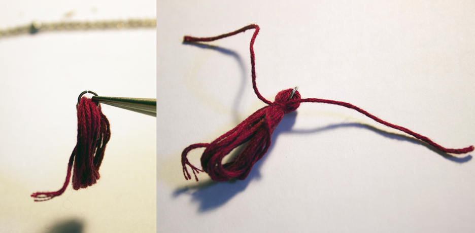 Step 4: Add a jumpring to catch all the wraps; then, cut a small piece of floss and tie a knot around all the threads, right under the jumpring. Cut flush to the tassel.