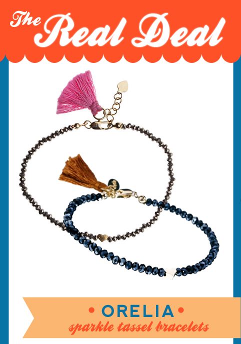 These dainty bracelets by Orelia are some of my favorites. I love to layer bracelets, and these lend themselves very well to that! They have a cool simplicity but still are unique with that cotton tassel at the clasp. The addition of a small metal bead in center sets them apart from just any other crystal bracelet!