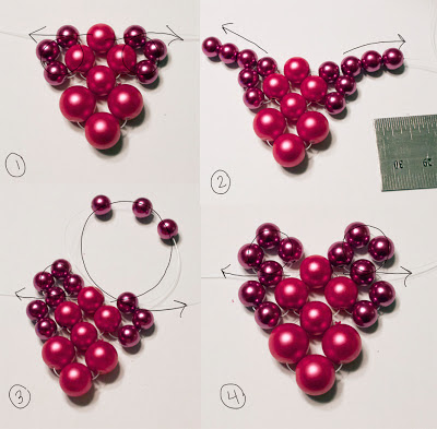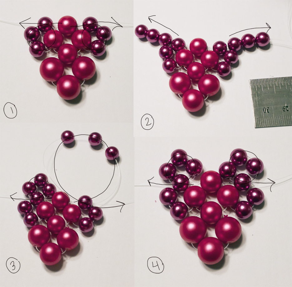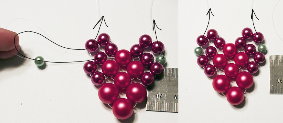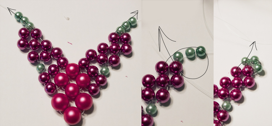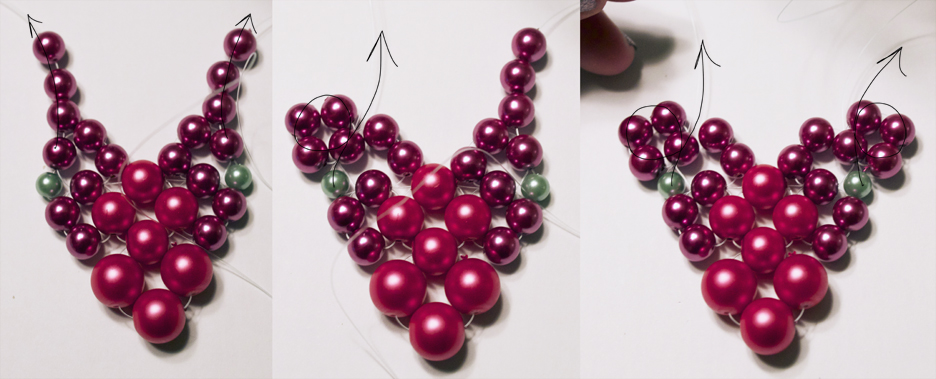Step 3: Take each of your strings, and loop them back through the outside bead of the second cluster, then through the top bead in this cluster (if you need help you can follow the arrows which show the pattern of the string). Now, add on three more beads on each right and left string. Now, string back through the top bead in the last cluster you made.