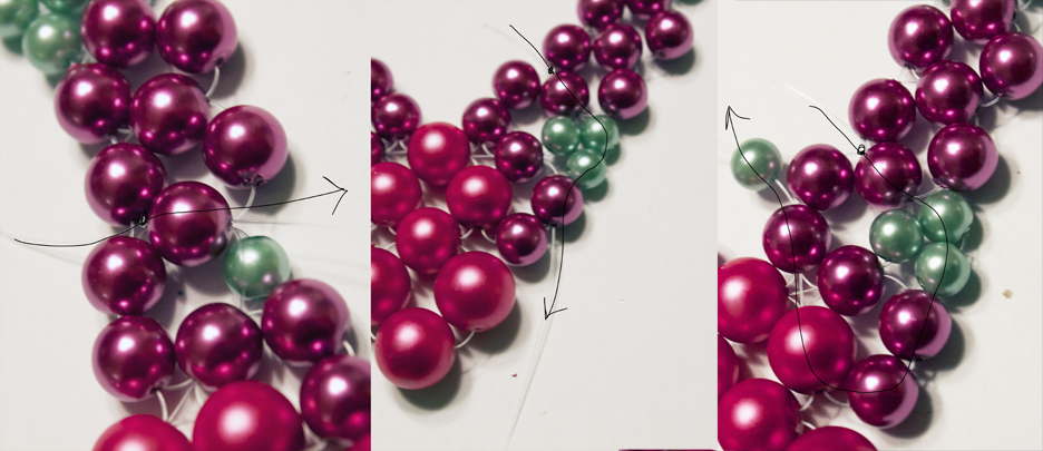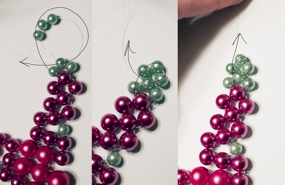 To make the last green cluster, simply cut about a foot of fishing line. Find the bead about two clusters away from your topmost light pink one (view picture) and tie a knot at one end of the line. Thread through this bead. Add on two green beads, and pass through the bead below that green bead added in step 4 (view picture). Weave through as the picture shows (3 beads) until you are at the top; add a green bead.