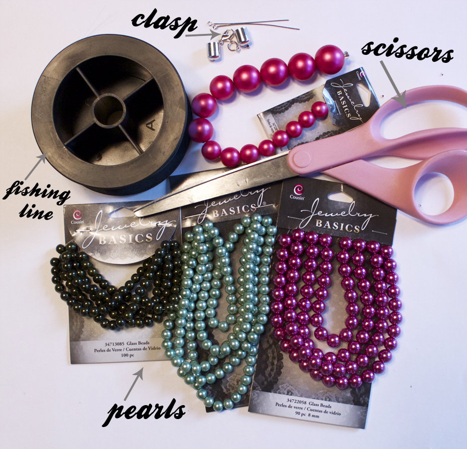 Step 1: Gather materials. Needed are scissors, fishing line, pearls *ALL FROM COUSIN* (6mm light green, 8mm fuchsia pearls, and larger 10mm or 12mm pearls.) I pictured those dark green ones but didn't end up using them, sorry! Also, you will need a clasp, two crimps, two looped headpins, and a end cones or bead caps to finish.