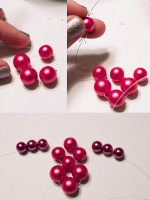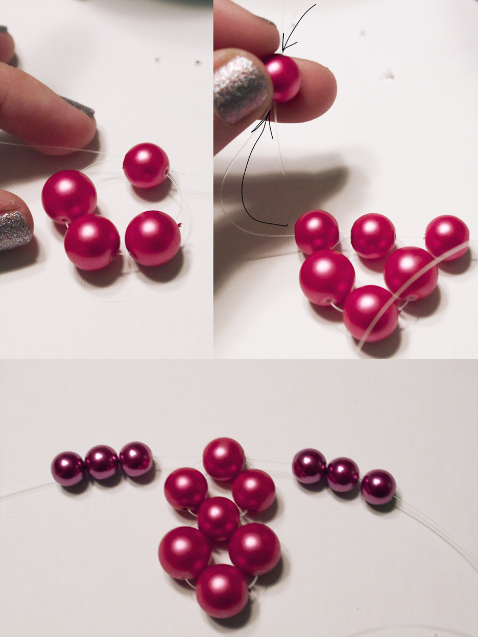 Step 2: Cut about 5' of your fishing line. Add on four pearls (the large 10mm ones). Thread the string in your right hand back through the fourth bead, in the opposite direction, to create a cluster. Now, add one bead on your right string and two beads on your left string. Thread the string on your right side back through the second bead on your left string. You will now have two clusters, on top of each other. String three pearls (the 8mm ones) on each right and left string.