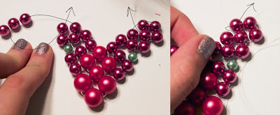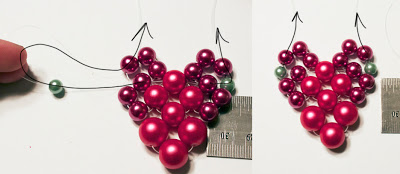 Step 8: Thread on three green beads, thread through the topmost bead from the last cluster, and back through the first green bead you added in this step.