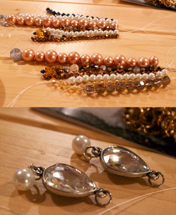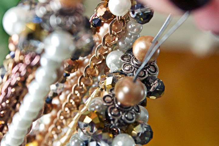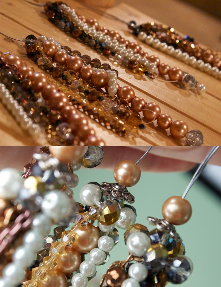 Continue stringing, making sure the same amount of beads are on each strand so your tassels are the same size. Make strands of pearls, crystals, glass beads and whatever other beads suit your fancy.