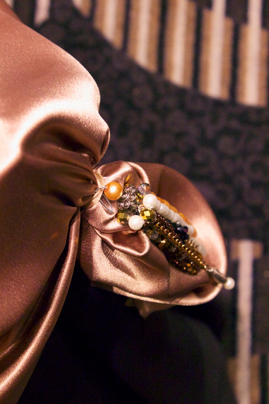 I made two flower arrangements for a bit of freshness. They had black tablecloths on all our tables but I amped mine up with a caramel-color satin overlay, where I added my tassels on the corners.