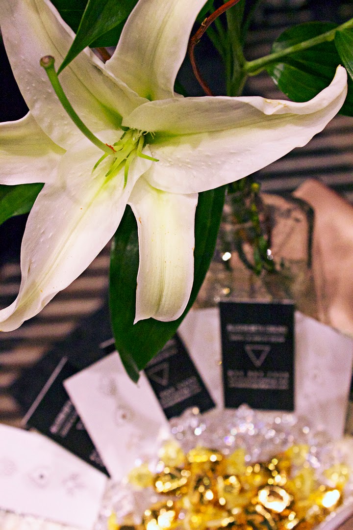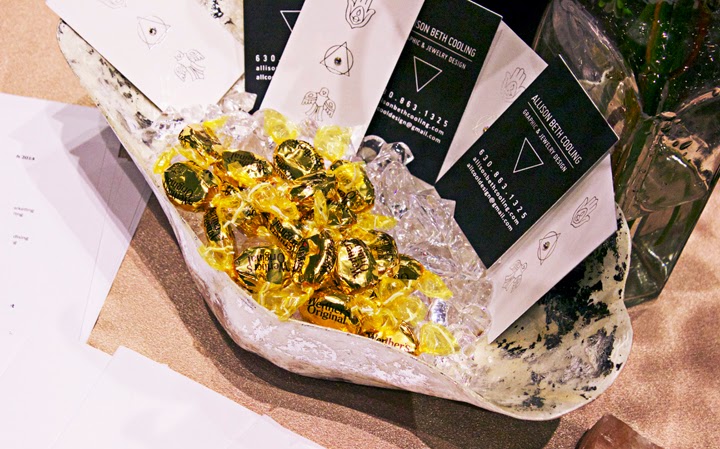 My business cards were in a silver-flaked shell dish and filled with acrylic diamonds. I had some caramel candy in there too! Of course the letterpresses cards were decked out with metallic foil and I added a Swarovski crystal flatback to the center.