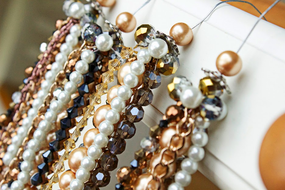 I've collected a bunch of different beads in different mediums; glass beads, crystals, pearls, chain, and some focal pendants. All the materials here I am using are from Cousin Corporation, and can be found at JoAnn fabrics, Michael's, AC Moore stores and Walmart.