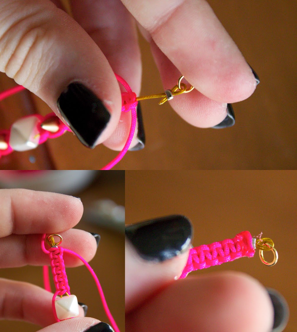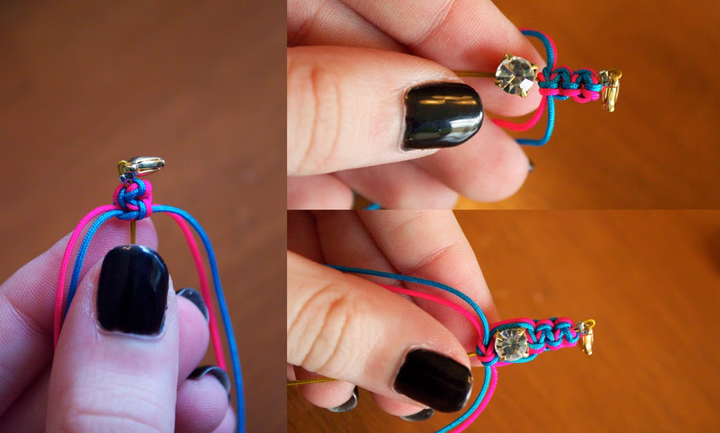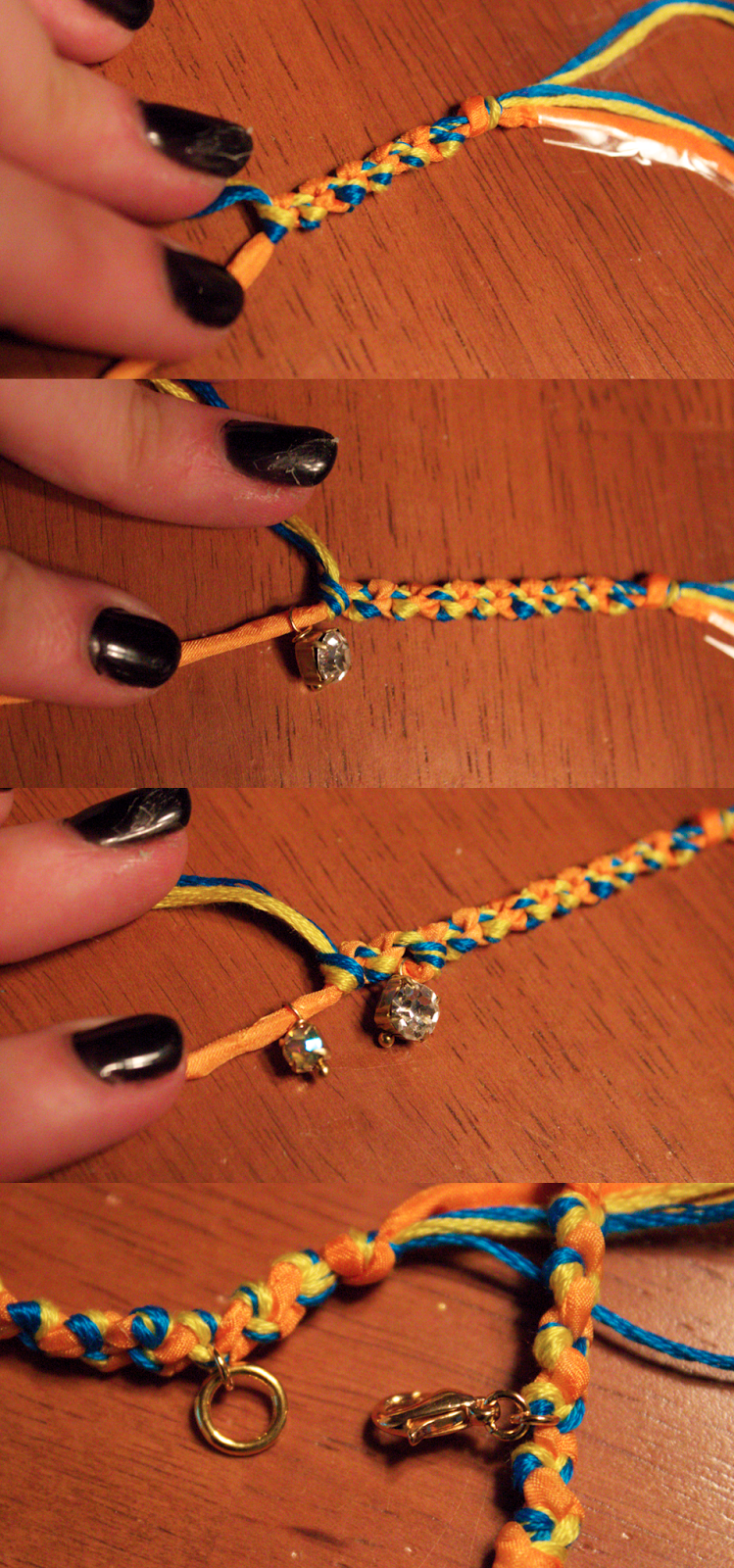Step 2: When you reach the middle, add on rhinestones or rhinestone beads (threaded onto looped headpins) to the silk, and catch in a knot. Then, finish by plain knotting. I added jump rings and clasps at the ends and cut the excess thread.