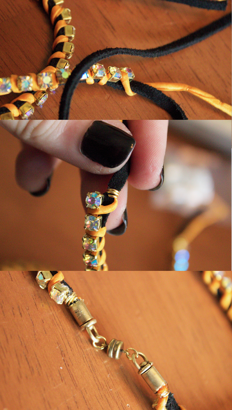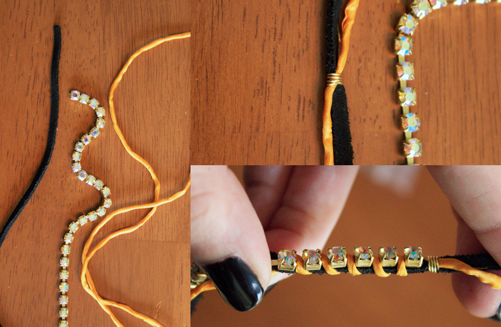 Step 1: Cut a length of leather that is 2.5 times the length of your wrist. With a length of silk cord about 3 times the length of your wrist, secure it 1" from the end of the leather by tightly wrapping with wire. Lay the start of the rhinestone chain on the leather and wrap in-between the links with the silk cord. Continue wrapping, everything should be laying flat.