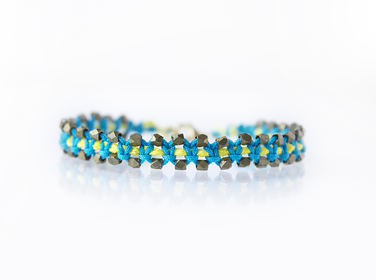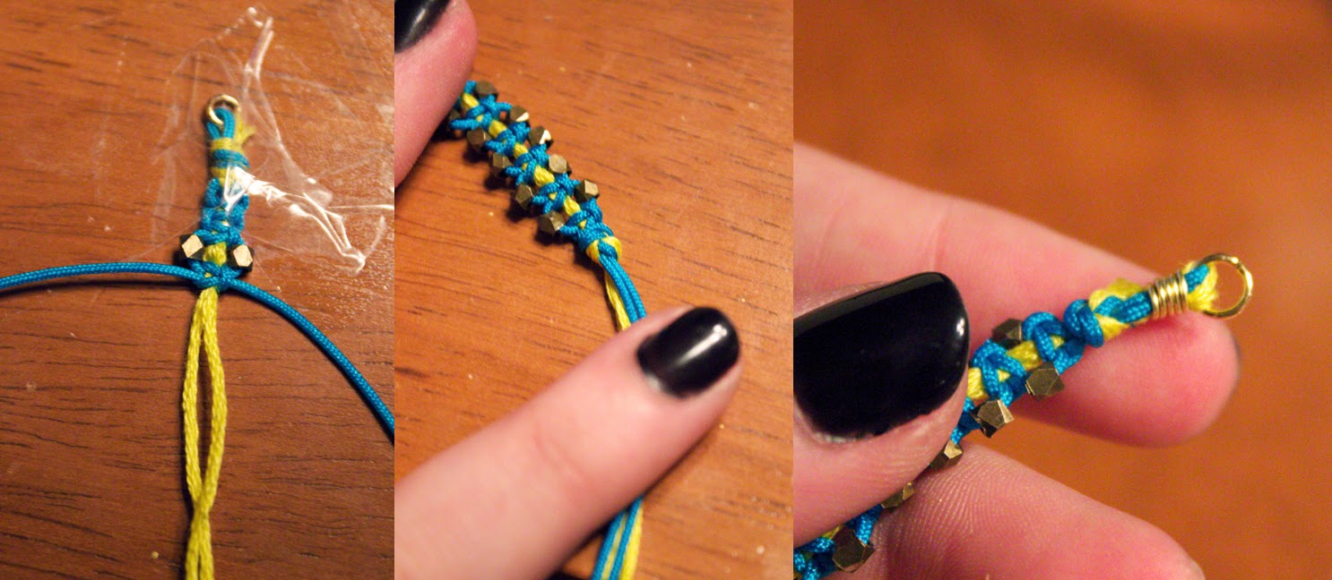 Once you have a couple of knots, simply add on a metal bead to each blue string and catch them within the knot!