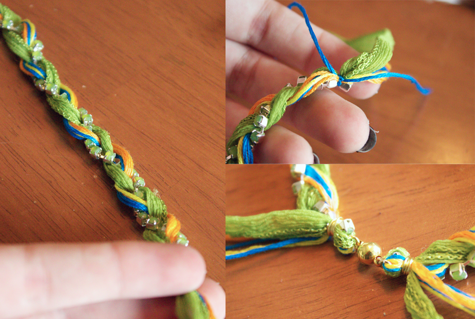 Step 2: Simply braid everything into a strand that is as long as you need your bracelet to be. You might have to cut the rhinestone chain to fit. Tie another knot with a piece of floss at the end. Finish the ends with a magnetic clasp. I secured the ends by tightly wrapping wire around the strands. Leave about an inch of excess string and cut the rest off.