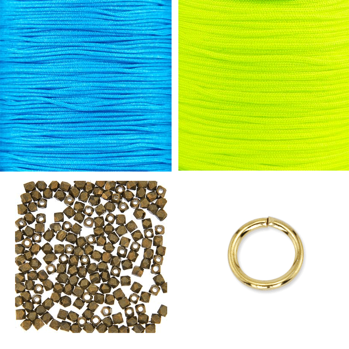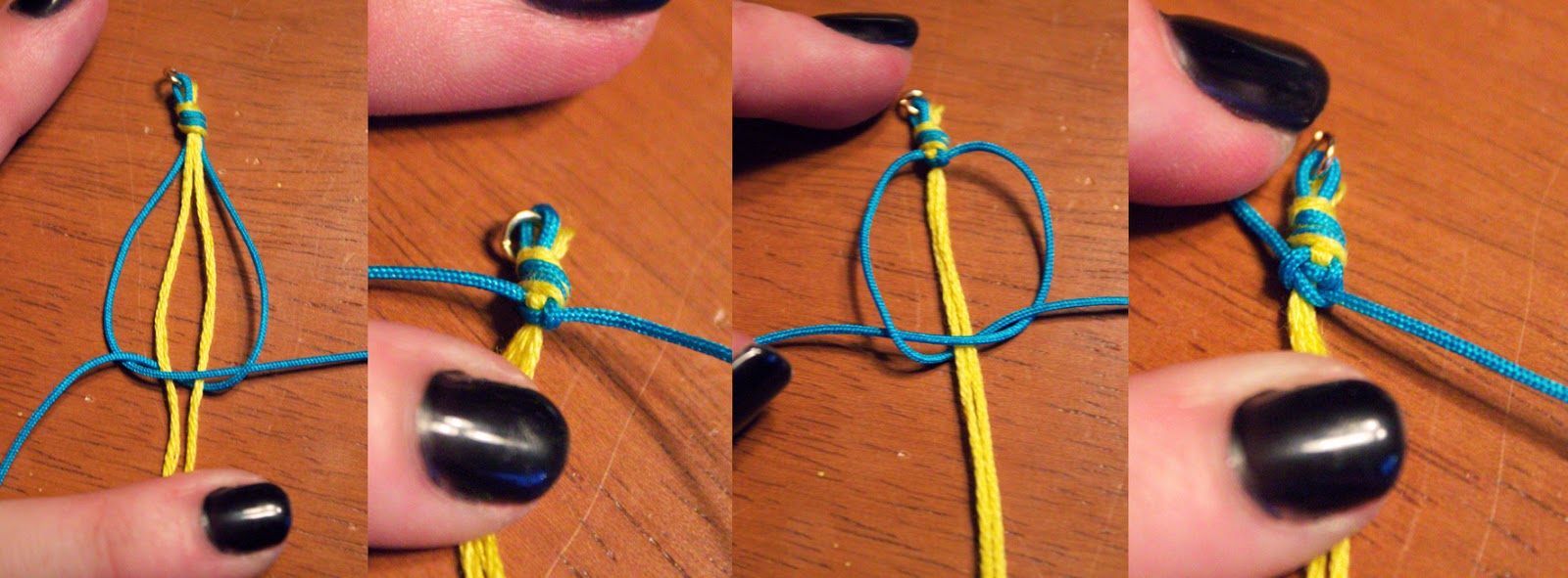 Step 1: Start the square knot sinnet. Cut one piece of cording (yellow) that is 3.5 times the length of your wrist. Cut a piece of (blue) cording that is about 8' long, and fold both of these cords in half. String on a jumpring and tie a knot to secure. Place the yellow cords in the middle. Take the rightmost blue string under the yellow towards the left. Take the leftmost blue string under the excess of the right string, over yellow and behind the right string again. Pull both strings evenly to tighten.