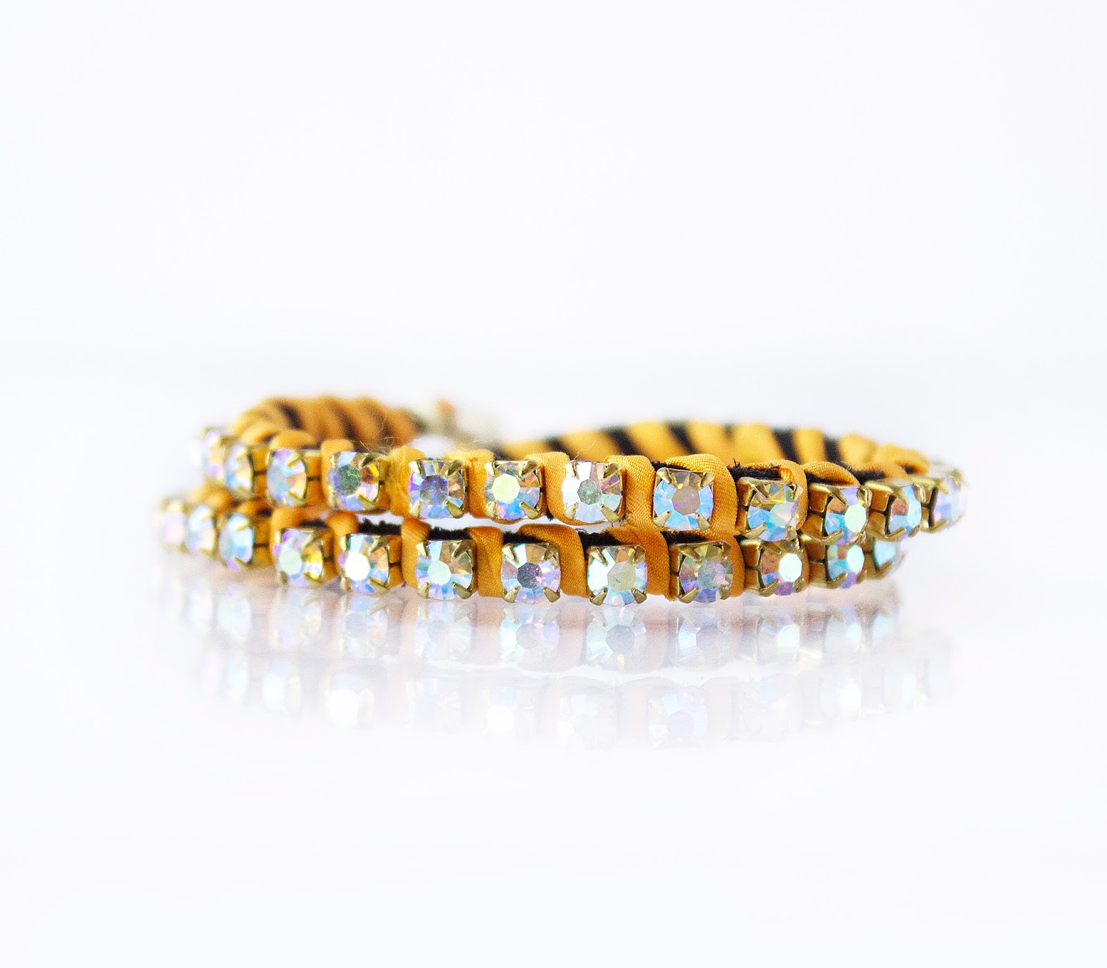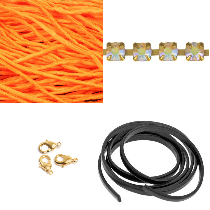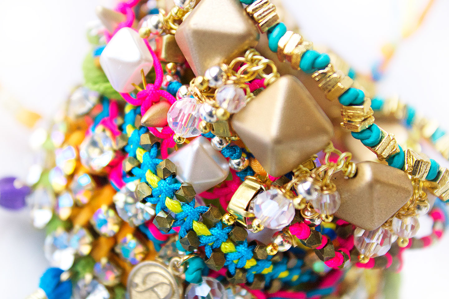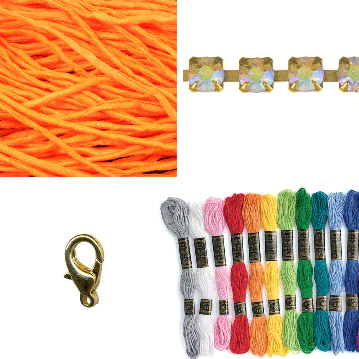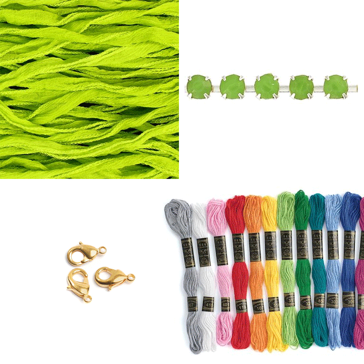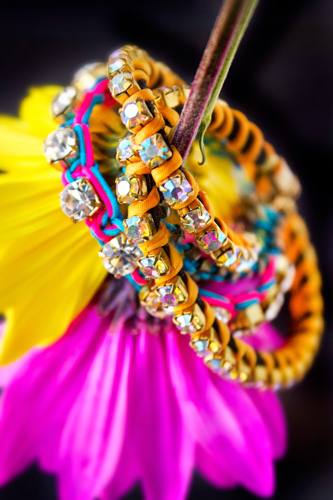 I was inspired by summery stacking bracelets and the colors of a Mexican fiesta to make my versions. Goody Beads' rhinestone chain is a must-have; so sparkly and a great, heavy quality. There are so many finishes and rhinestone colors/sizes to choose from.