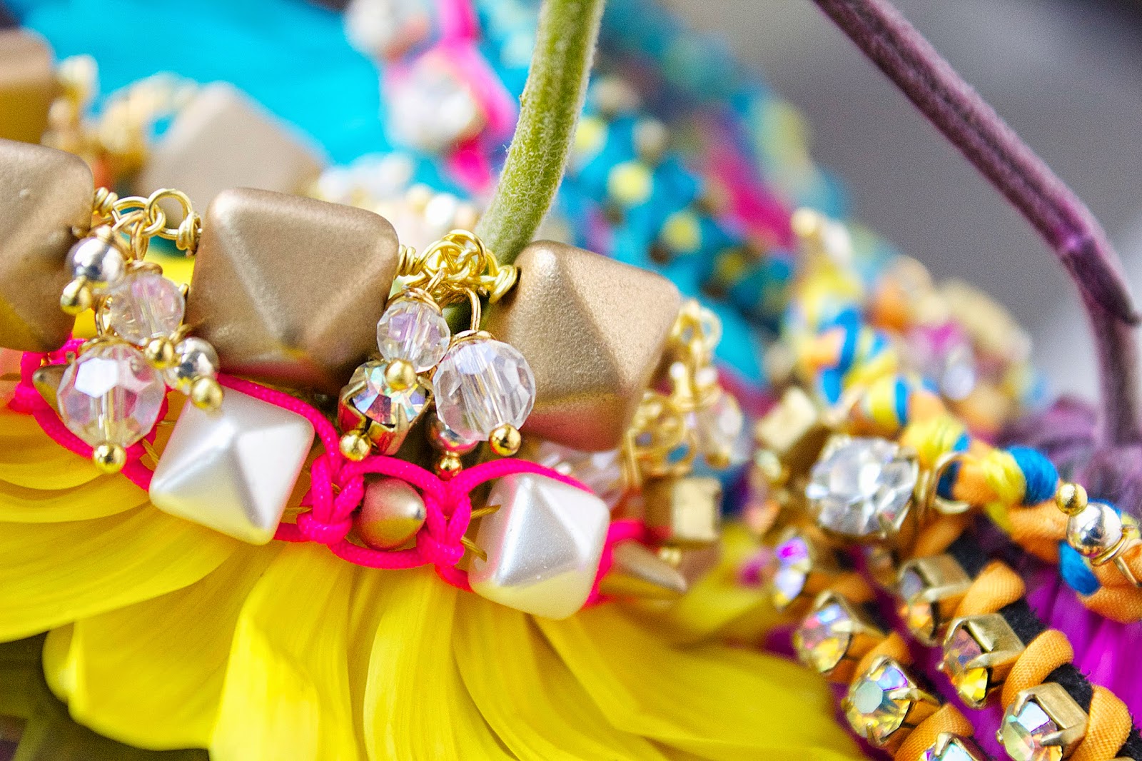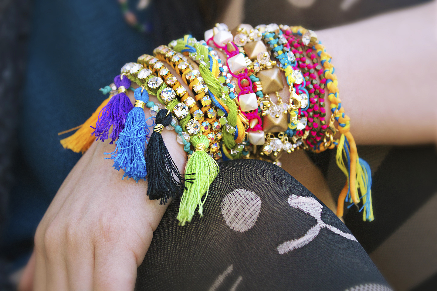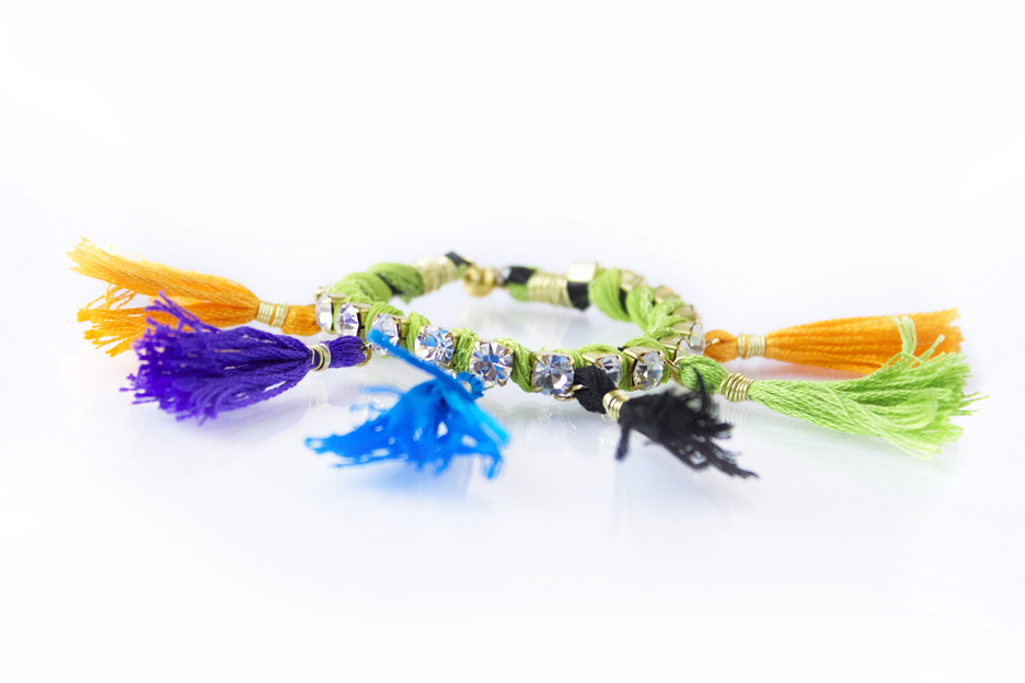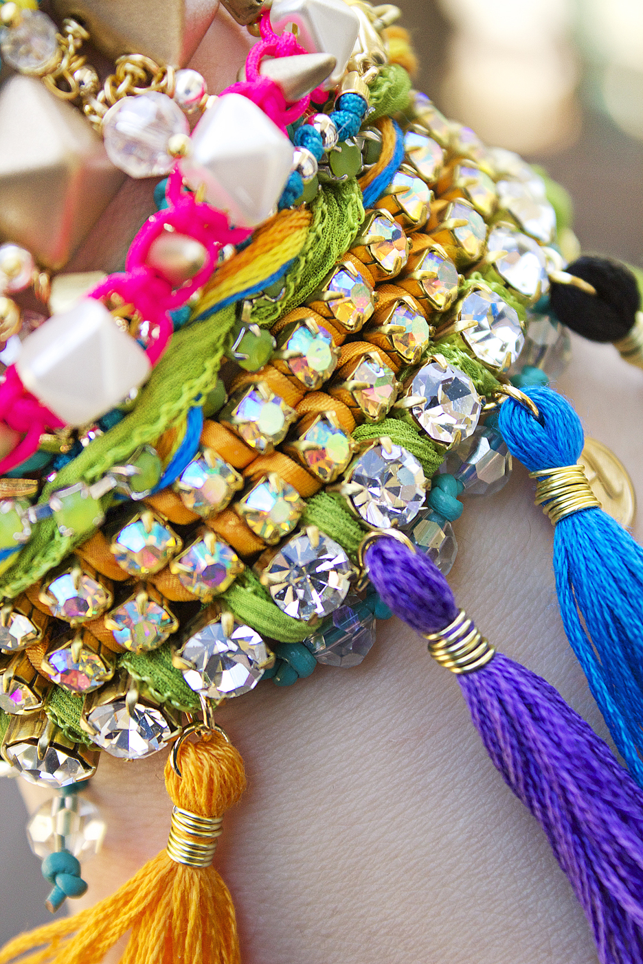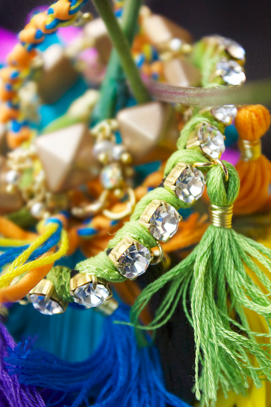 I'm kind of obsessed with Goody's Czech Glass pyramid and spike beads; these are just my style! Plus, they add a bit of edge into the colorful bunch. I am also using embroidery floss I got from my local craft store to make the tassels, because tassels rock.
