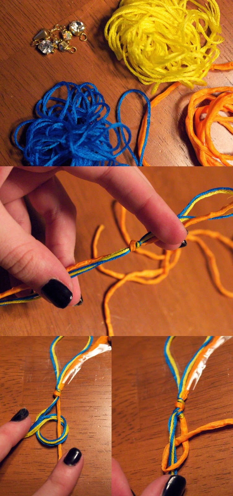 Step 1: Cut about 3 times the length of your wrist from two colors (but four strands) of floss and the silk ribbon. Tie in a knot at top. Simply tape down, and take your floss OVER the silk t the right, behind the floss towards the left, and over the beginning of the floss. Pull the knot tight (not super-tight!) with your left hand, keeping it on the left side. Then, take the silk over the floss to the left, behind the floss towards the right and over the beginning of the silk. Pull tight with your right hand. Keep this going….
