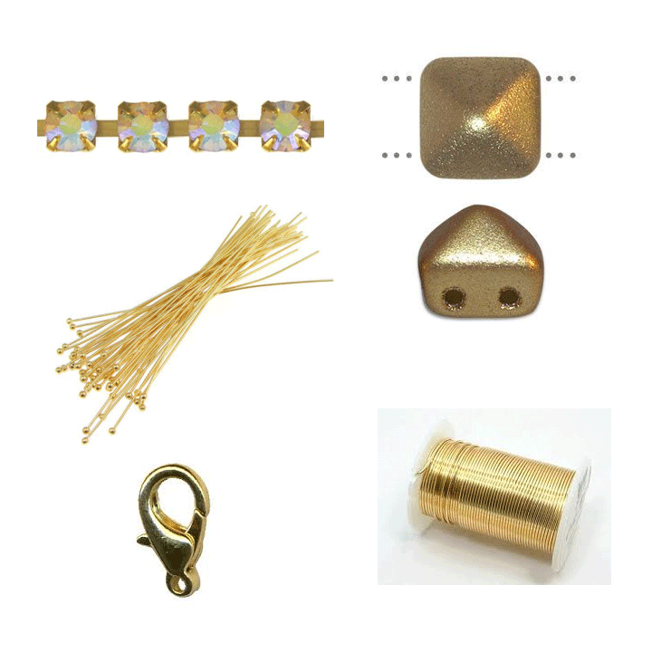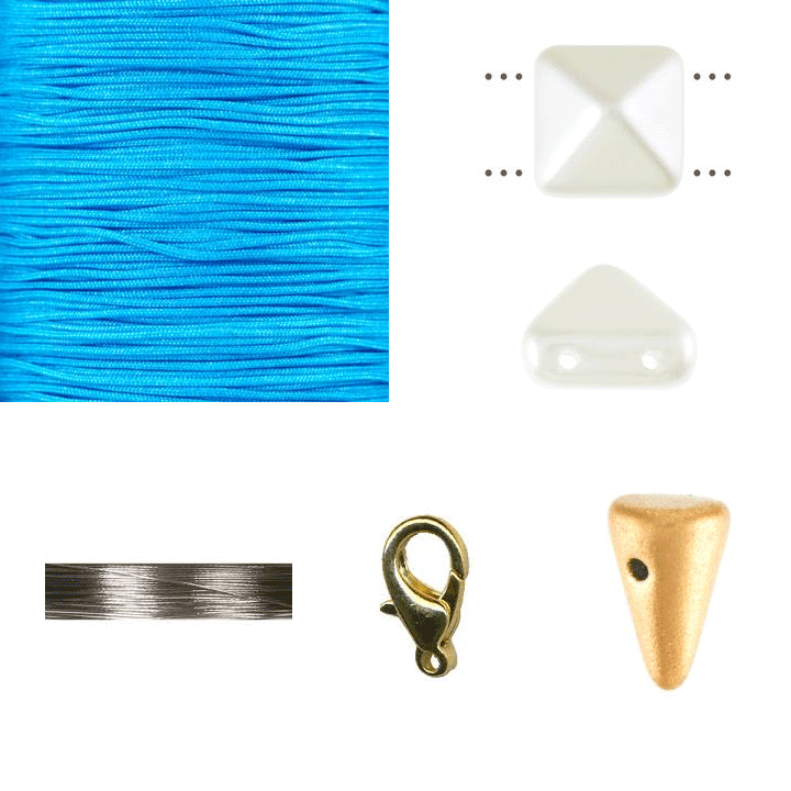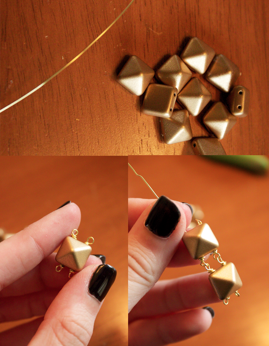 Step 1: Starting with one pyramid bead, create wrapped loops on all four sides with wire (24 gauge). Attach the next bead to it by wrapping loops, catching the first bead's loops within. Keep doing this until you have used enough beads to make your desired bracelet length.