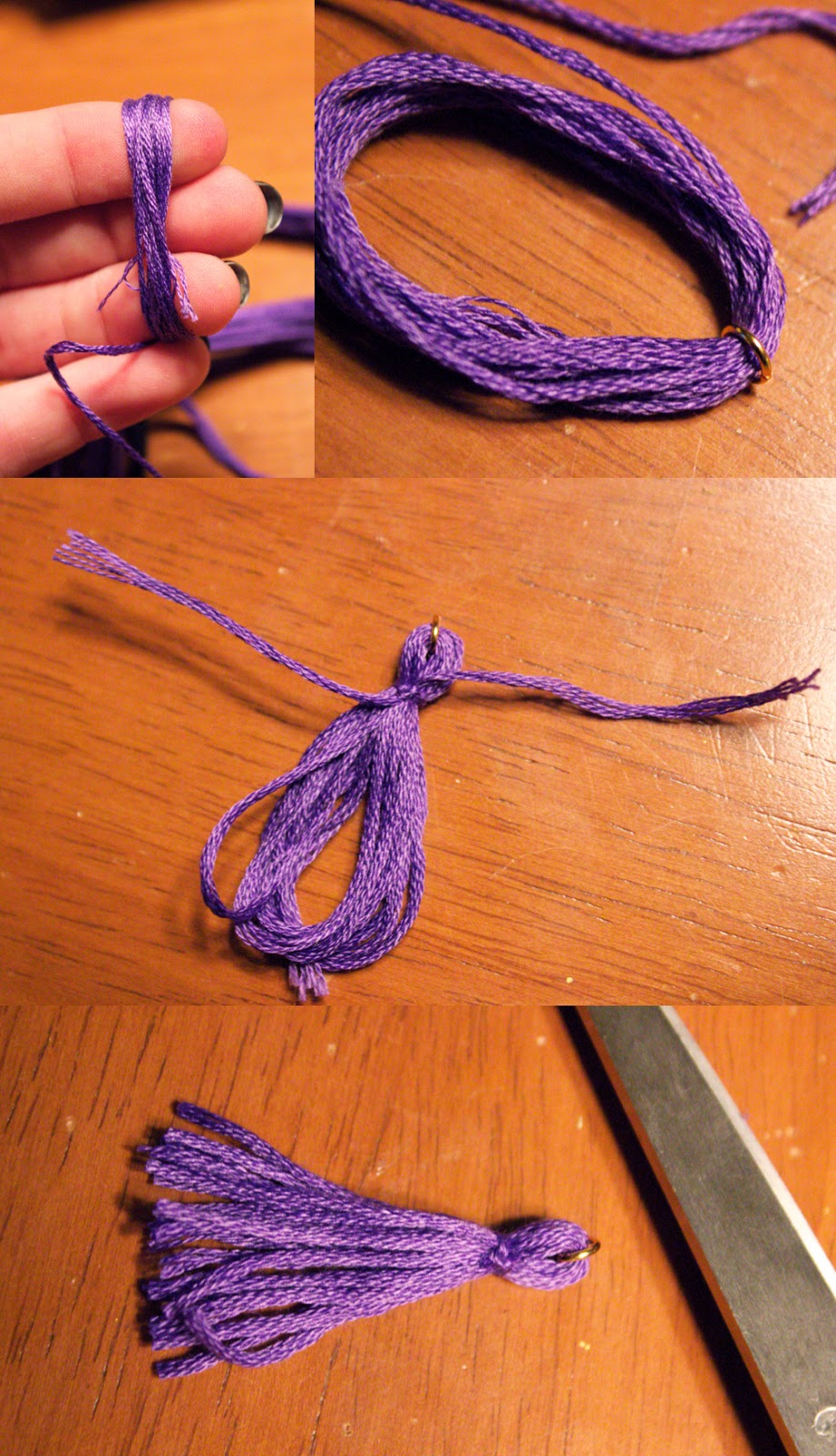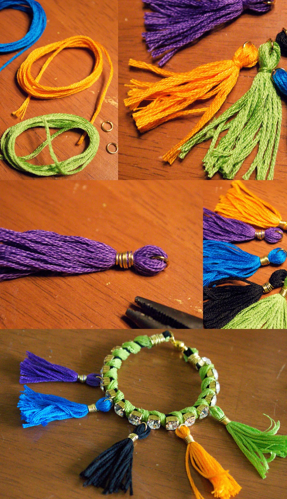 To make the tassel version, I used bigger rhinestones and green silk fairy ribbon, but the technique was the same. Simply make embroidery floss tassels by wrapping floss 10 times around your two fingers, add a jumpring around the loop. Tie near the top with another piece of floss, cut the excess. Then, cut through the loop to make the tassel.