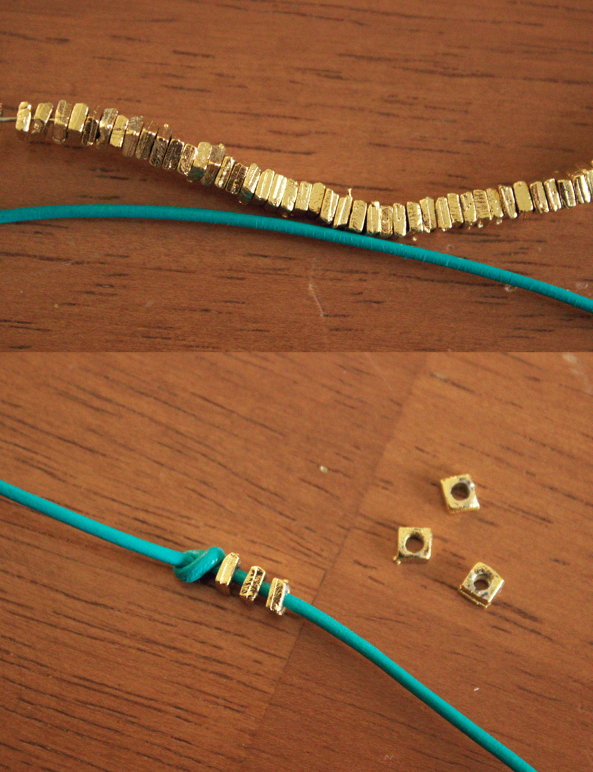 Step 1: Gather your beads and leather. Start somewhere in the middle of your entire piece of leather. Tie a knot. Add three beads...