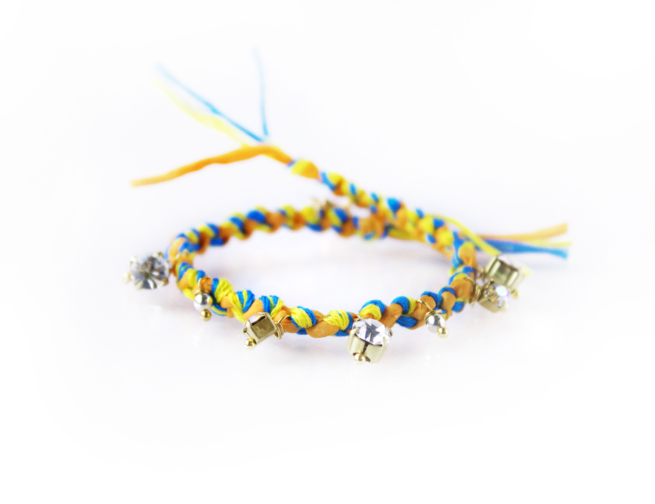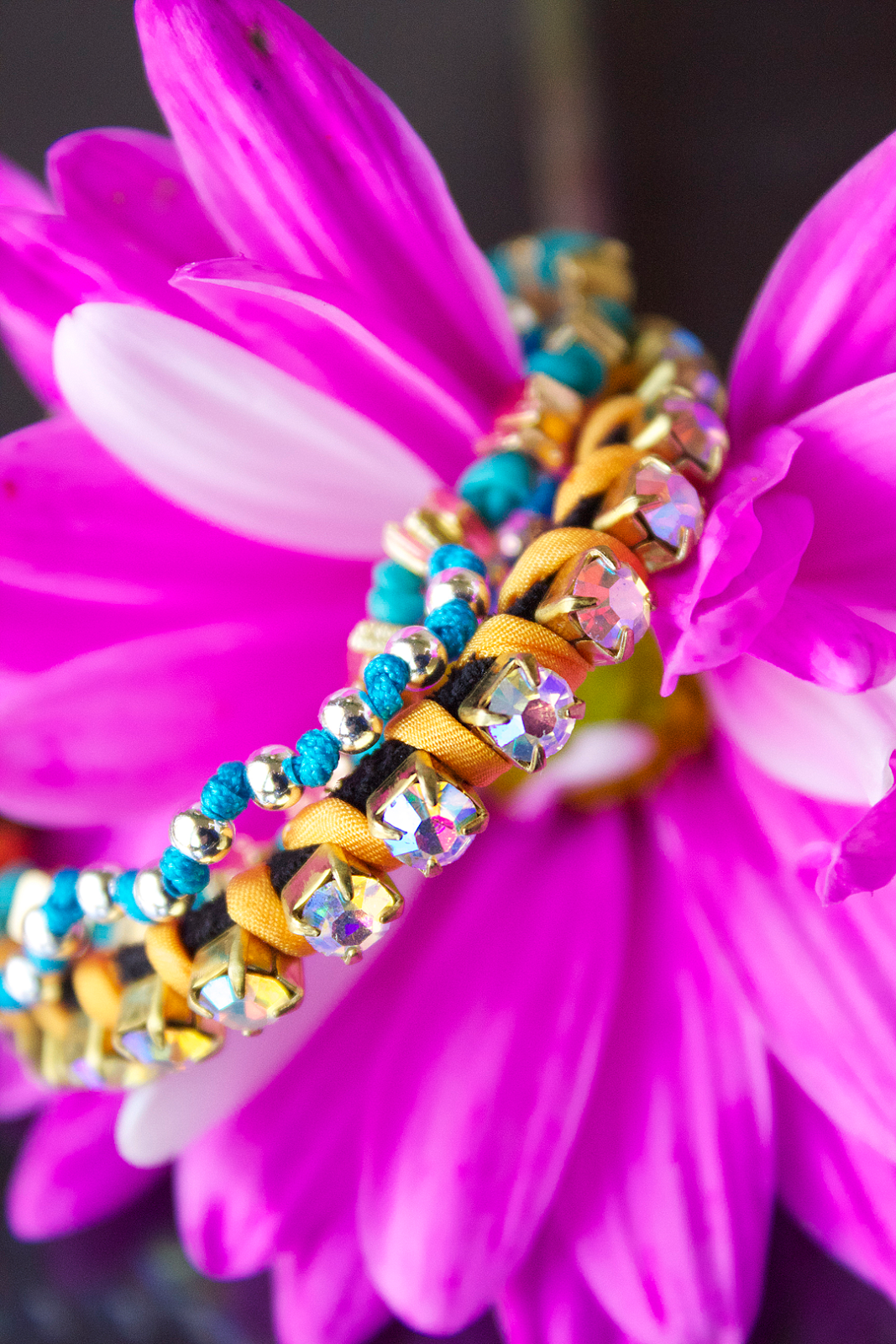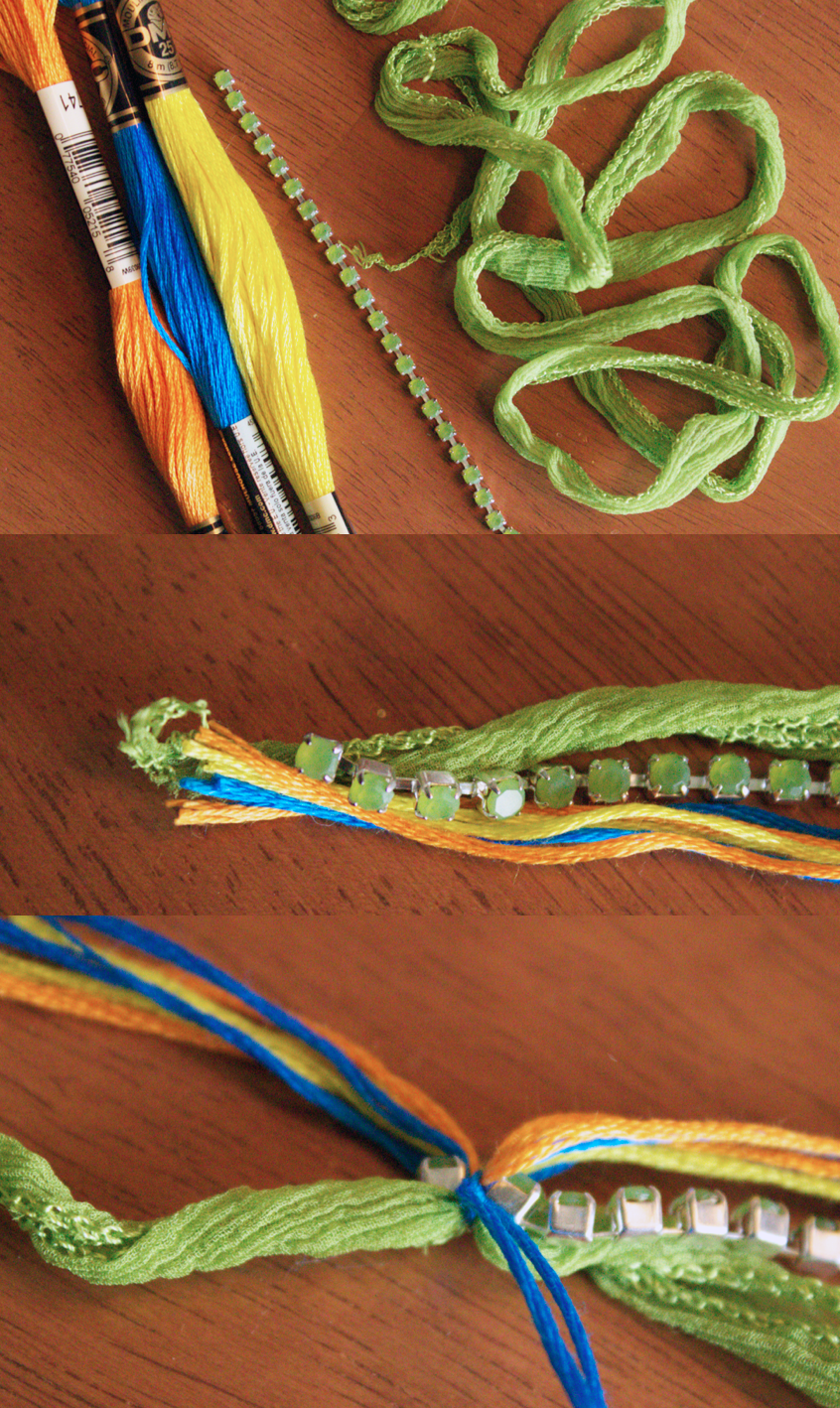 Step 1: Cut a piece of rhinestone chain and silk ribbon that is 1.5 times the length of your wrist. Then, cut that same length in three different embroidery floss colors. Take a small piece of embroidery floss and tie everything together in a knot, catching the last rhinestone link. Cut the excess.