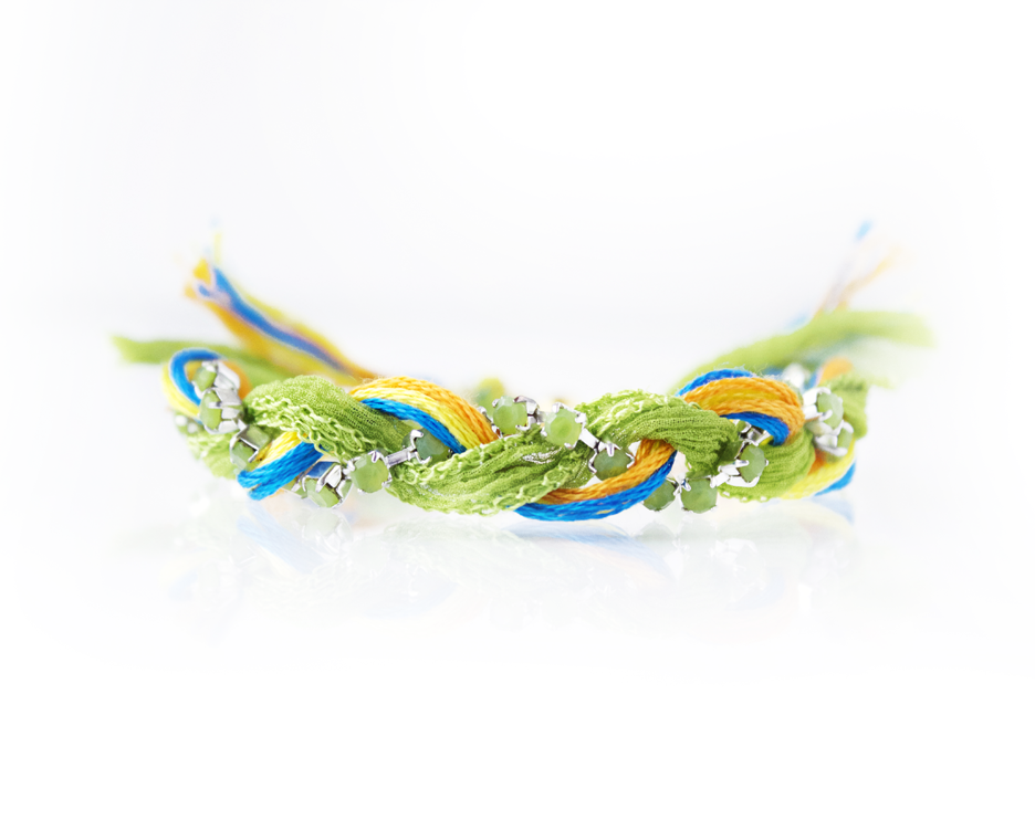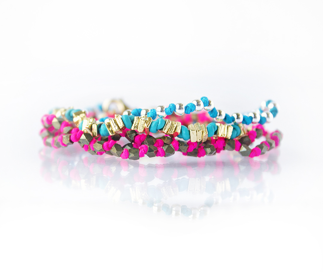 I'm also using great silk cord and ribbon, which give the bracelets a luxe look. I used them for braiding and wrapping. Goody Beads' leather is also great for knotting. You can get all different colors and sizes.