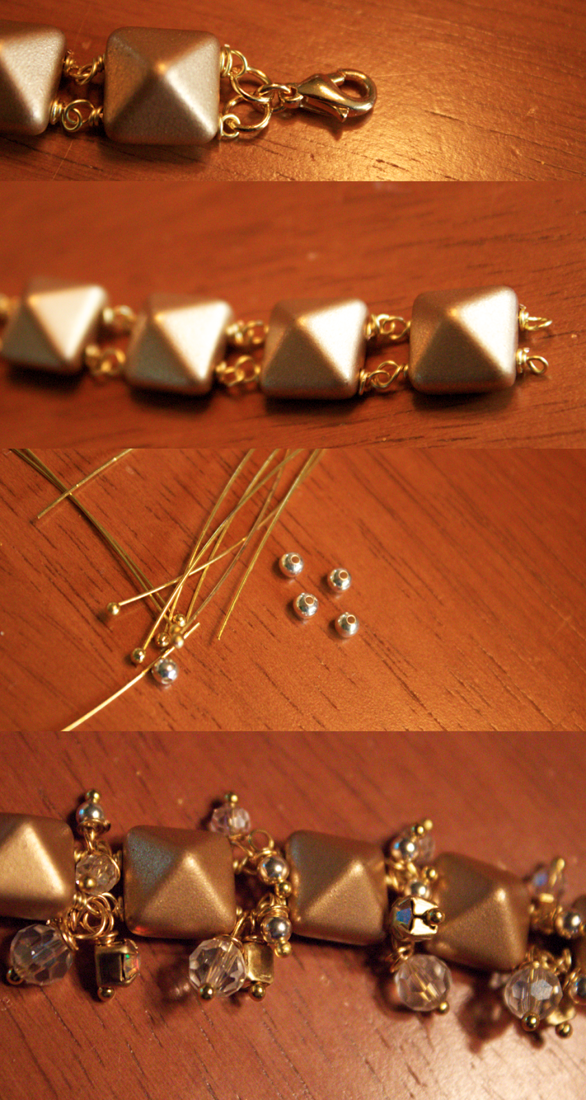 Step 2: Add jump rings and a clasp on the unfinished ends. Then, simply decorate the loops with beads, crystals or rhinestones, attaching headpins with the beads on them. You can add as many or as little beads as you want! I used silver beads, crystals and leftover rhinestone chain.