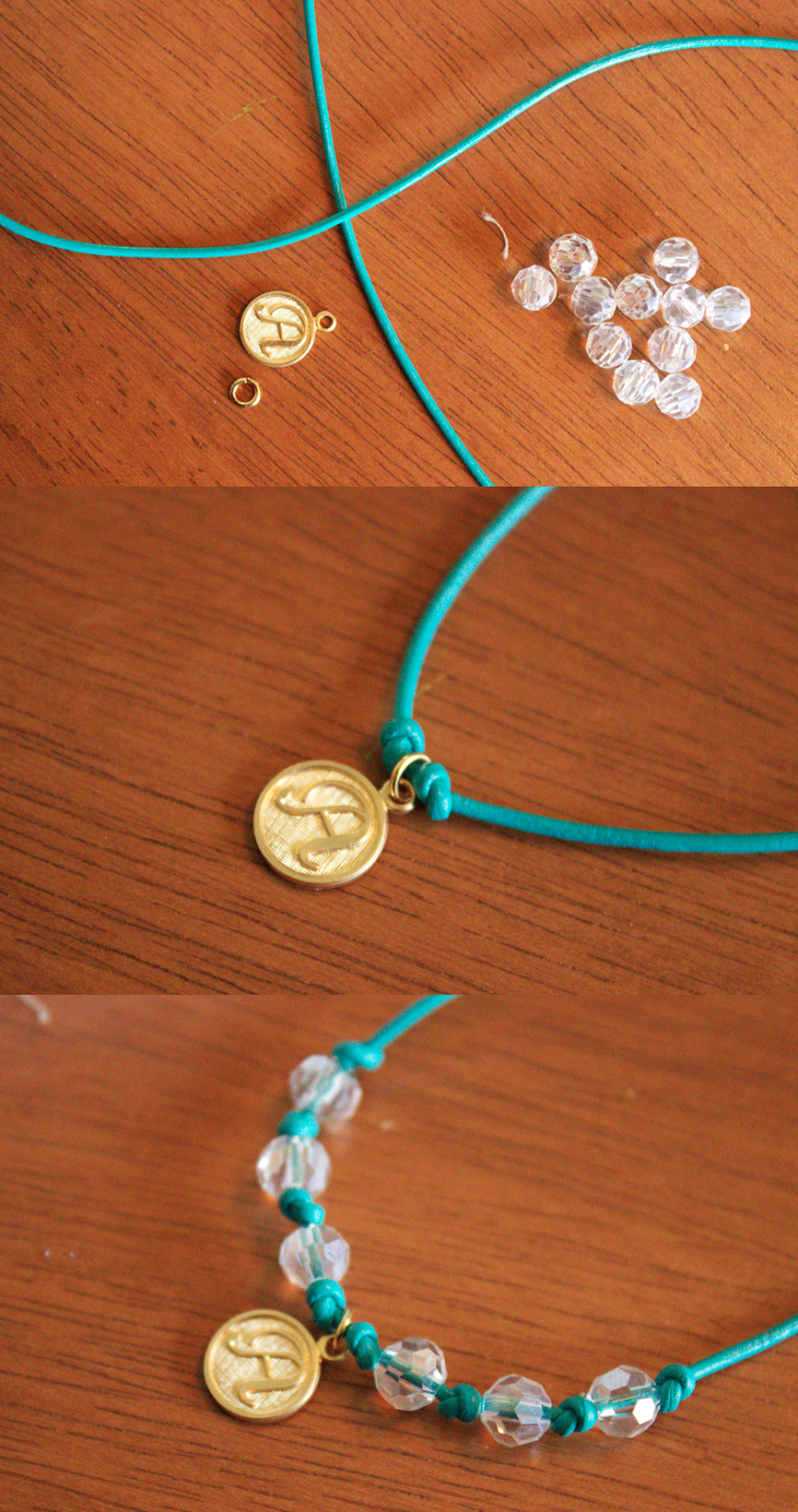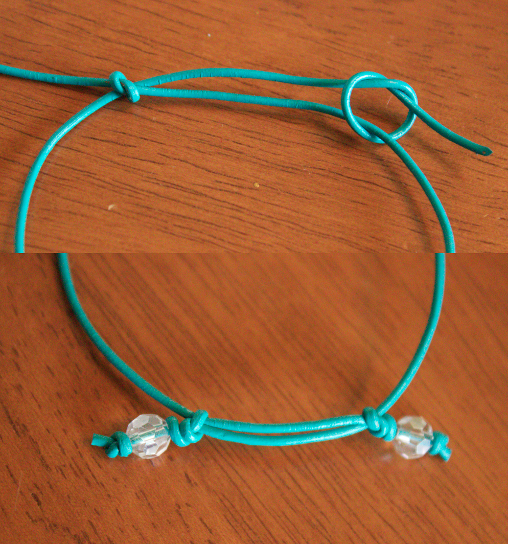 Step 1: Cut a length of leather 2 times the length of your wrist. Add your charm to the middle, and knot it in place. Add three more crystals on the sides, knotting in-between.