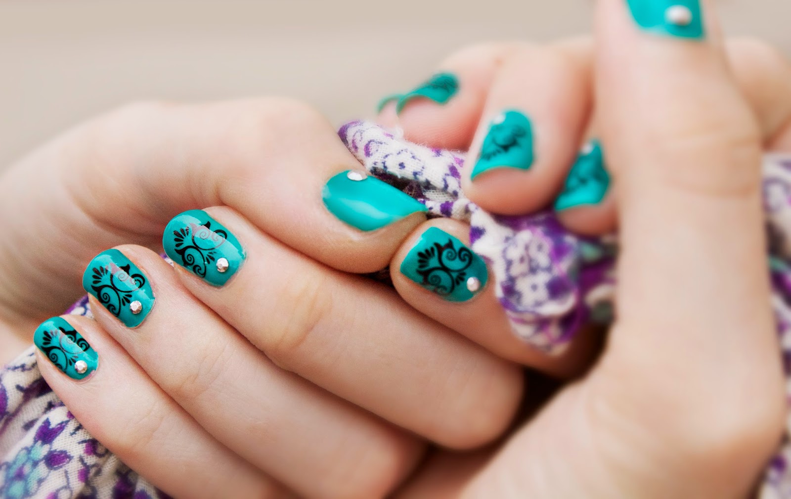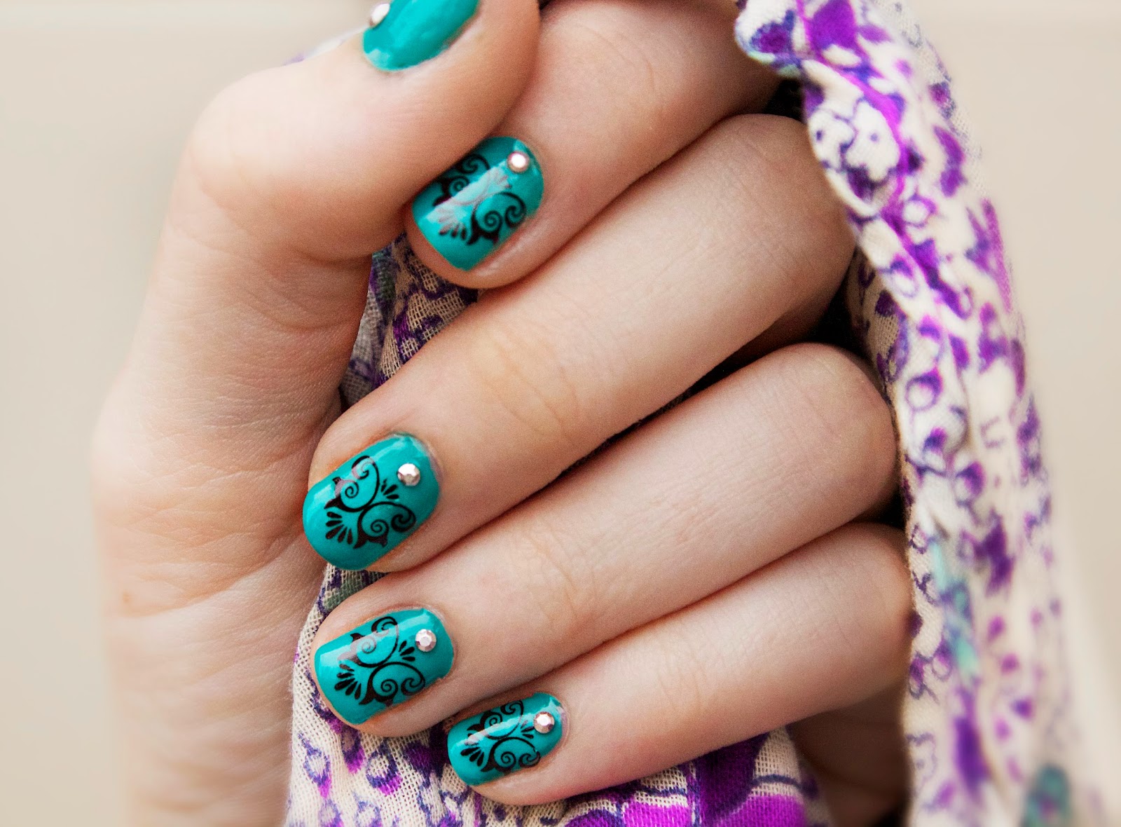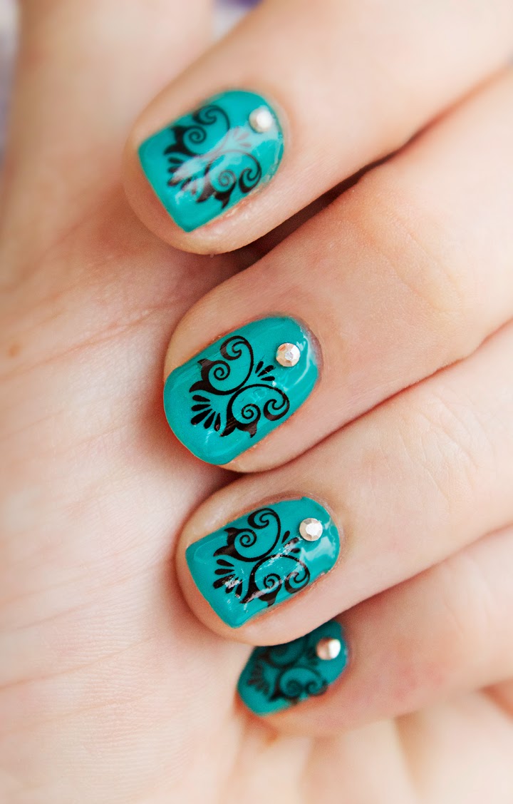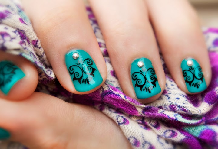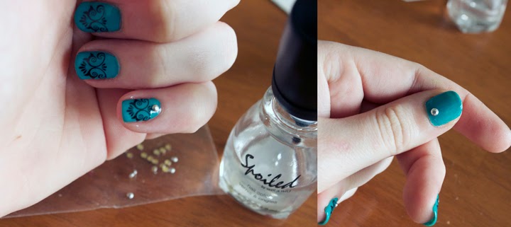 I then, when they were fully dry, painted with a top coat and stuck a nail stud at the top of each decal. I placed one bigger one on my thumb as well. The BornPretty decal sheet came with 10 black decals and 10 white decals enough for 2 manicures. I accidentally dropped the one for my thumb while doing the tutorial and trying to photograph :(. So I added just a stud to the thumbs.