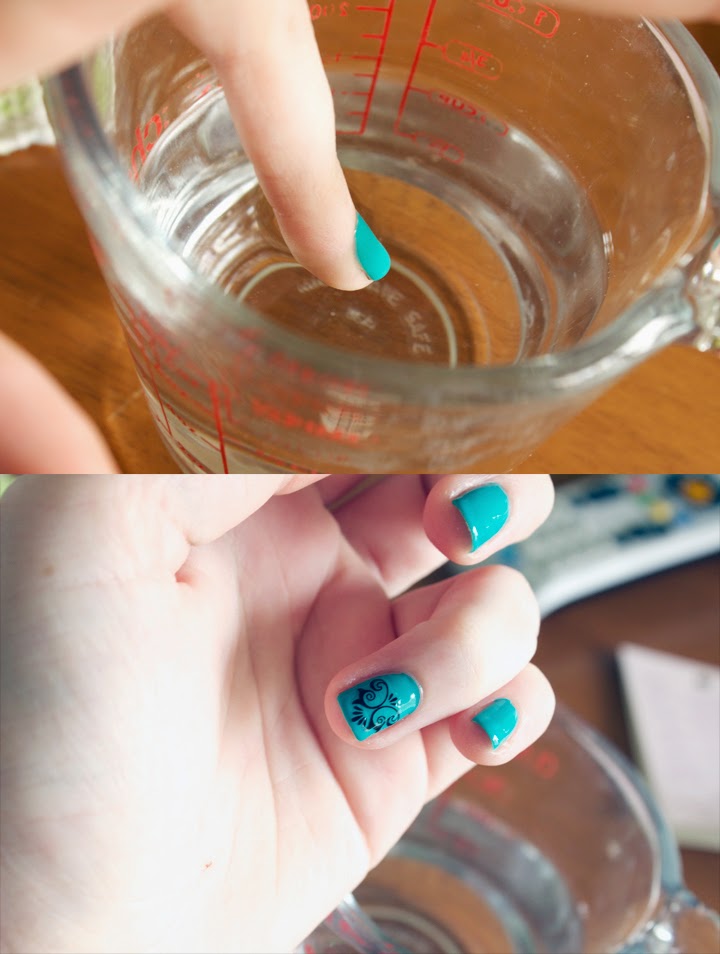 Paint your nails your base coat. Get out a dish of water. Cut out the decal you need. Take off the plastic film, don't peel it off the white backing.