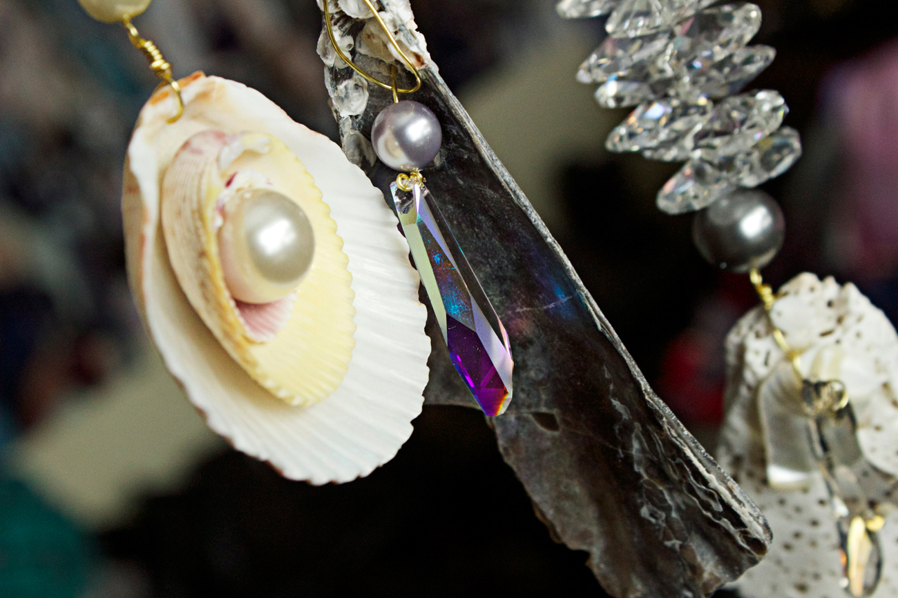 Step 1: Gather materials. Needed are seashells (preferably hand-picked!), pliers, fishing line, 24g gold wire (mine from Cousin), pearls or crystals (mine Swarovski Create Your Style and Jewelry Basics distributed by Cousin), chandelier-style crystals (mine vintage), Swarovski crystal pendants or any other large pendant crystal. I used a coral-shaped one and then this Crystalactite Pendant.