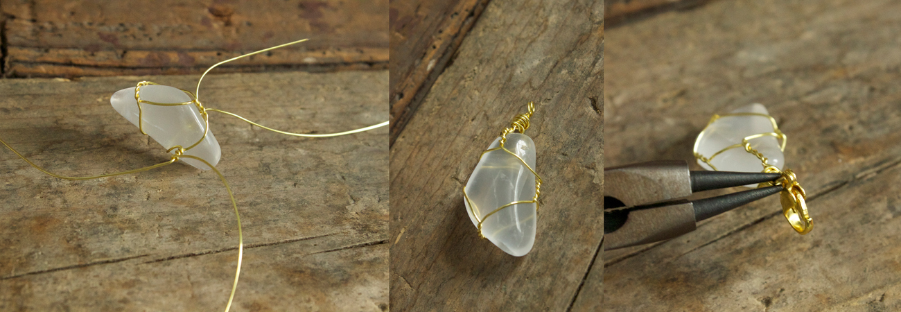 Now, twist the two frontmost wires together five times, then the two back most wires. You should be "enclosing" your stone. You may need to do more wraps, depending on the size of your stone. At the top, simply create a top-wrapped loop with all wires and cut the excess wire. Add a jumpring to the top loop, and attach your clasp.
