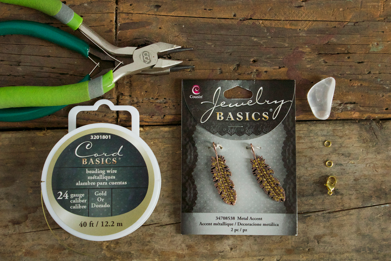 Step 1: Gather materials. Needed are pliers (wire cutters and round nose), 24 or thin gauge Cousin wire, pendants or charms (my feather charms are from Cousin), jump rings and a lobster clasp. Finally, your gemstone. I am using girasol opal here. It helps to have somewhat of a triangle-shaped stone.