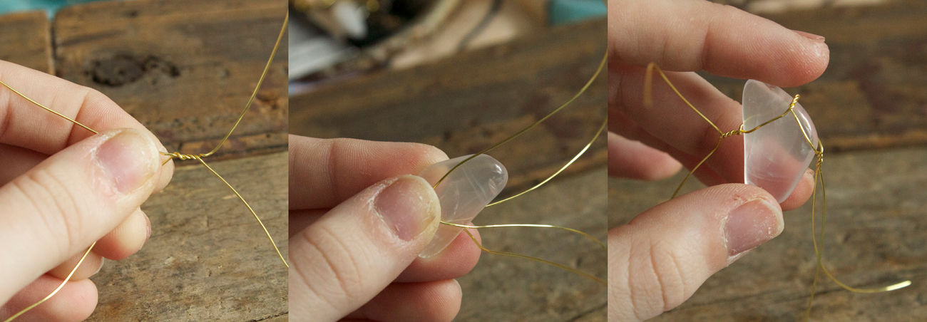First start by cutting two 12" lengths of wire. In the middle, twist together about 5 times. Situate this twisted part right at the bottom of your stone. Bend all the ends up. Turn your stone upside dow. Twist the two leftmost wires together another five times, catching the bend of the stone in the twist. Repeat with the rightmost wires.