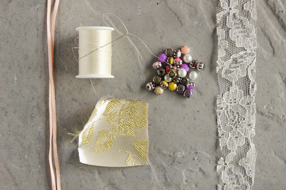 Step 1: Gather materials. Needed are 6mm pearls (mine from Pandahall), 8mm sew-on montee rhinestones (mine from Pandahall), lace scraps, ribbon, brocade fabric, sewing thread and needle.