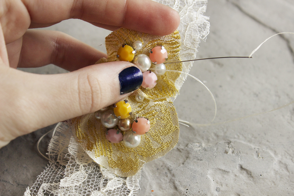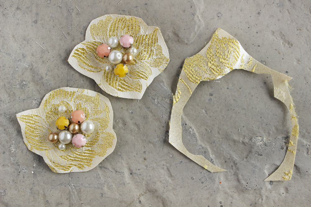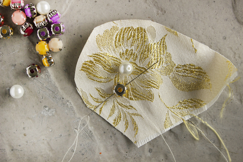 I used a vintage brocade fabric with foiled flowers, that matched my more neutral-color rhinestones. Also, the flowers provided good sewing spots. If you use more of an abstract patterned fabric, find the coolest (or most interesting) parts to embroider on.