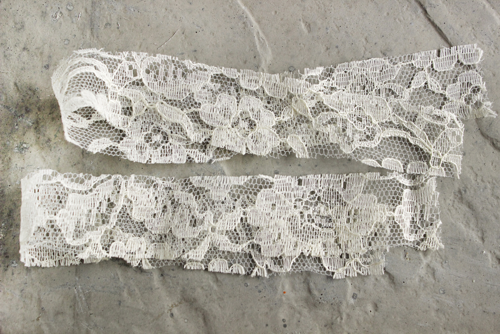 Step 4: Cut out two pieces of lace - make sure these are long enough to go around half of your head (the other half of the headband will be ribbon). I cut them about 1.5" wide. I'm doubling up the lace for a sturdier headband. Stack these lace pieces right on top of each other.