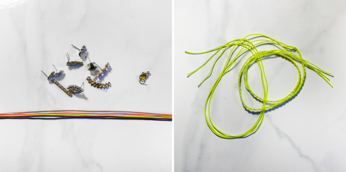 Step 1: Gather materials. Needed are 4mm and 6mm jump rings, flat nose pliers, 1.5mm Chinese knotting nylon cord (in all colors!), lobster clasps and miscellaneous earring posts.