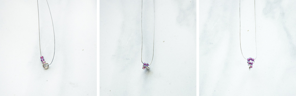 Step 2: Cut about 1.5 feet of wire. Thread on a jumpring, and then 3 seed beads. Take the righthand side of wire and thread back through the last 2 seed beads you strung on the left side, from top to bottom. Pull tight to hold. Thread on 3 seed beads to the lefthand wire, and again, thread the righthand wire back through the beads, from top to bottom. Pull tight again. They should stack upon another.