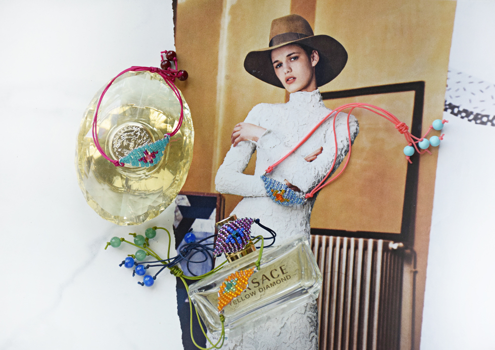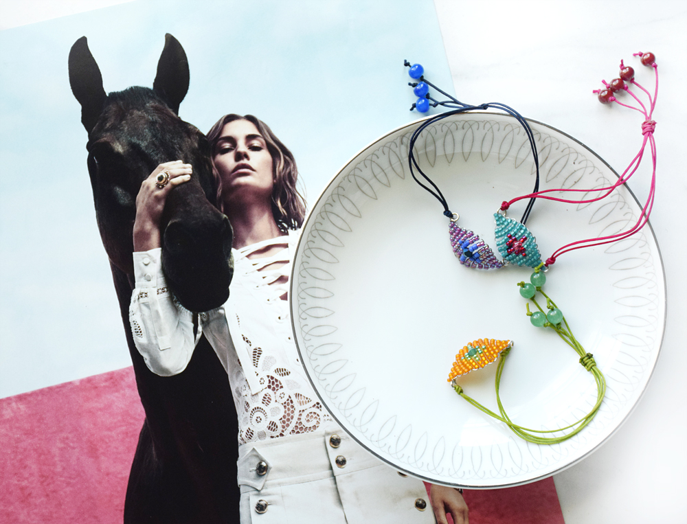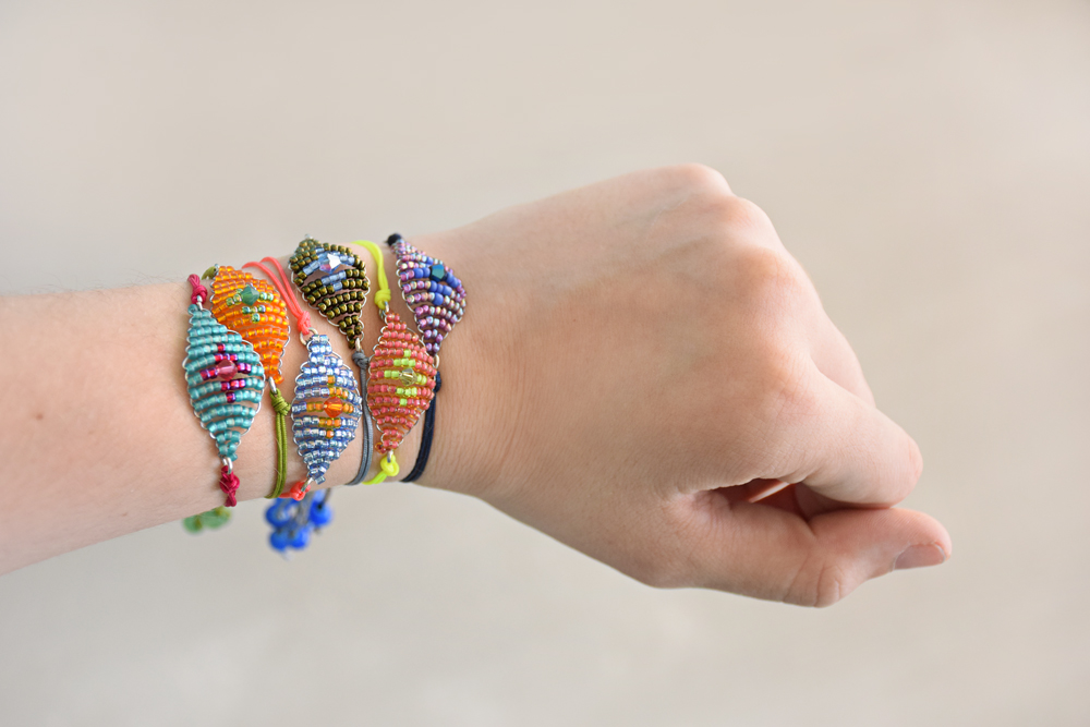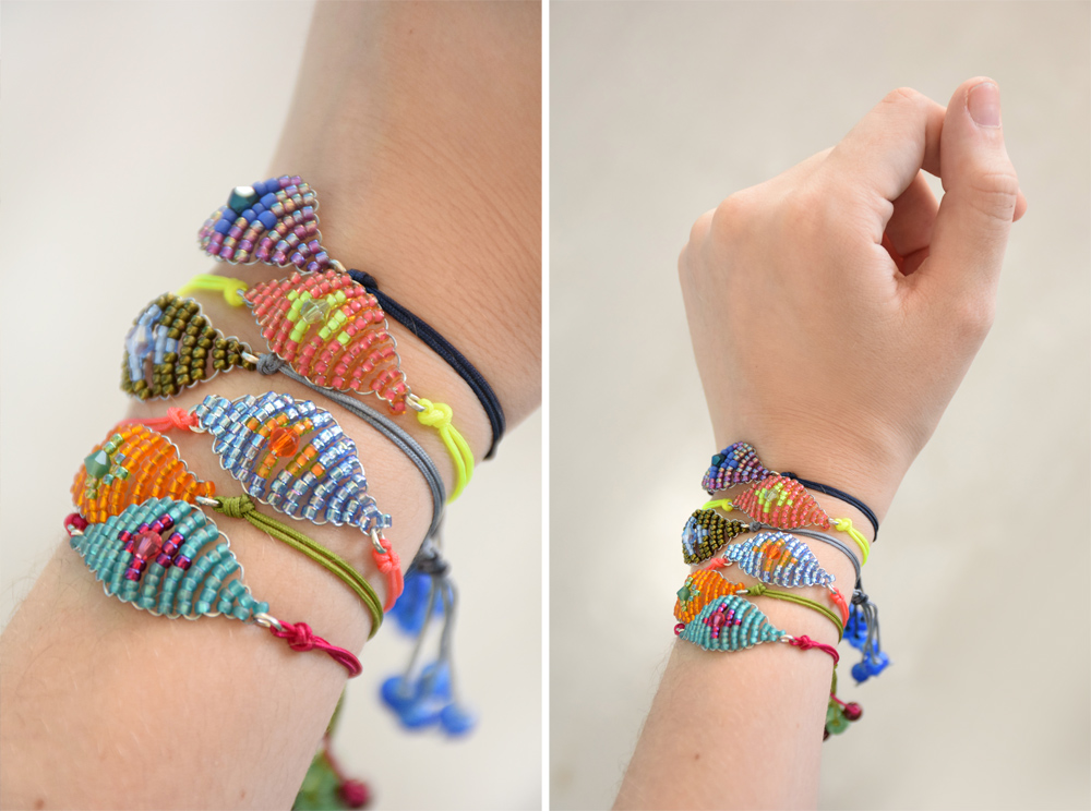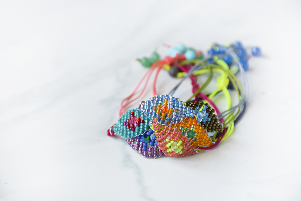 What's awesome about these is that you can make them in a rainbow of colors, and they come together really quick. They are a new take on the old friendship bracelet pattern, and the hint of Swarovski crystal in the center dresses them up a bit. Always good.