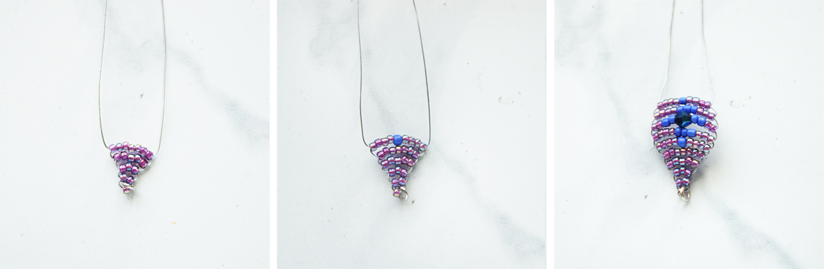 Step 3: Repeat this technique. On the next layer, thread on 5 seed beads. Then 7 seed beads. Now, to form the middle of the eye, thread on 4 seed beads, 1 accent seed bead (in a different contrasting color, one that matches the 4mm crystal you want to use) and then 4 more seed beads.