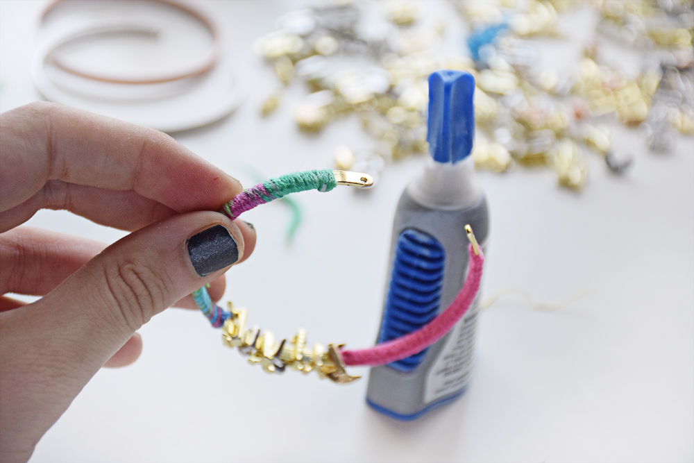 Secure with another knot, and superglue in place. Wrap the other side of the bangle in the same manner.