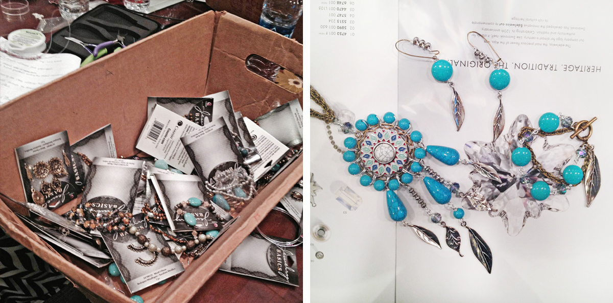 Last retreat, I created my Cosmic Chic set, using black and blue beads and wire in an edgy silhouette. This year, I was inspired by turquoise strands I found to create a woven dreamcatcher-themed set I entitled Hippie Dreams.