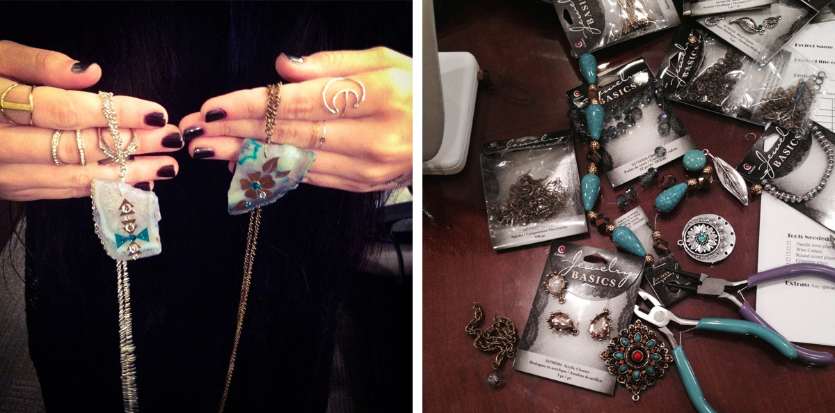 On the third day, we were designing again. I chose agate pendants and glitzed them up with Swarovski flat backs and metallic tattoos, to create totally beachy, gypsy-like layering necklaces. We shot videos showing our special projects. Shelly did her signature wire wrapping, Rachel created a beaded necklace, Rebecca wire wrapped-rings and Jennifer made simply chic earrings. We had one more meeting about Prima Bead, Cousin’s partner online bead store.