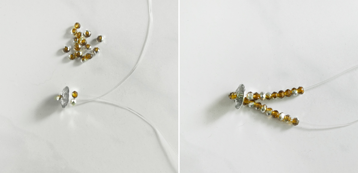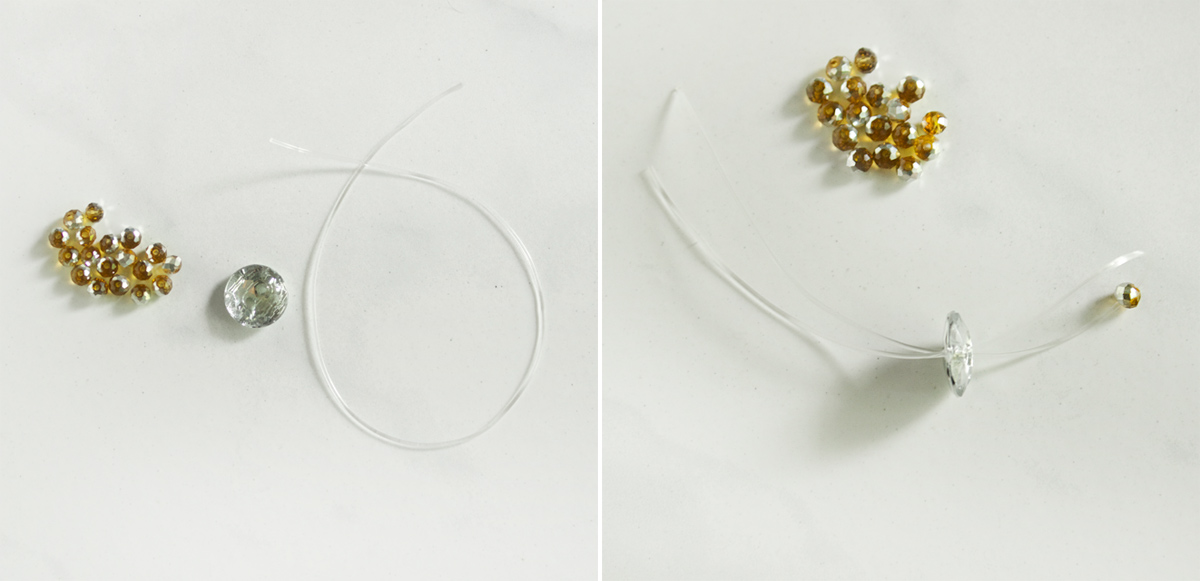 Step 2: Start out with a 5″ piece of stretch cord. Thread on one crystal bead to the cord, then thread each side through the top of the button, catching the bead.