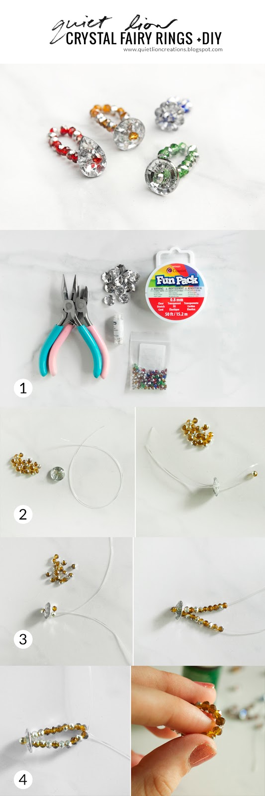 You can almost see the sparkle and twinkle of fairies flying around these glittery treasures! My newest tutorial combines gleaming rhinestone buttons and silver plated crystals to create delightfully dainty stacking rings. This is a beginner tutorial, so everyone can enjoy making these!