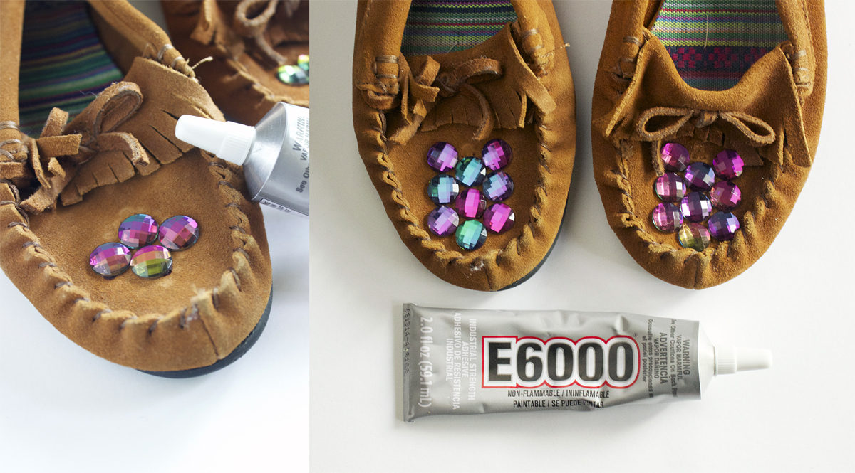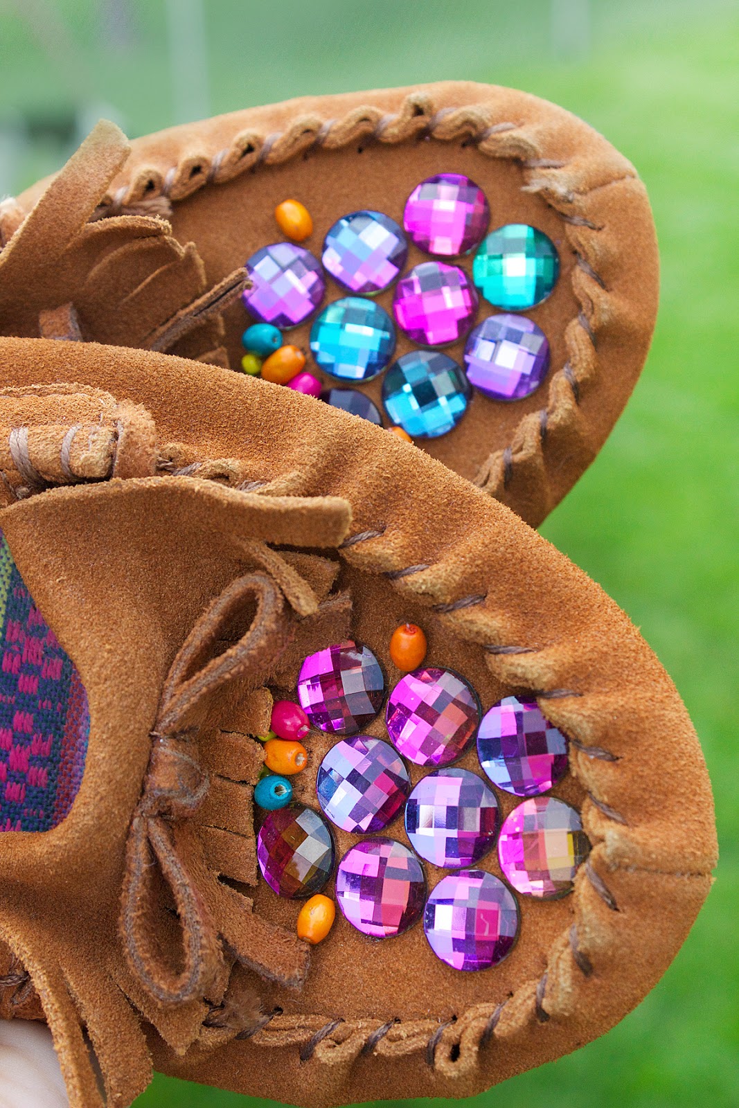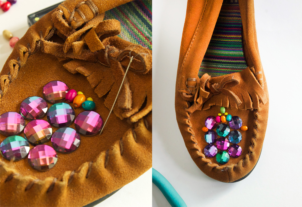 Just some quick sewing and gluing will have your tired moccasins looking supa’ fresh in no time. I think the mix of colors here and those cool iridescent rhinestone flat backs mix perfectly.