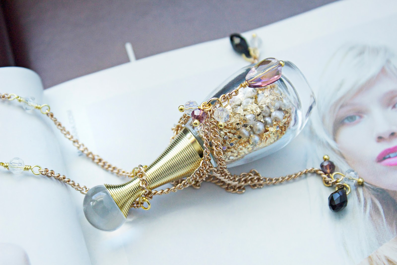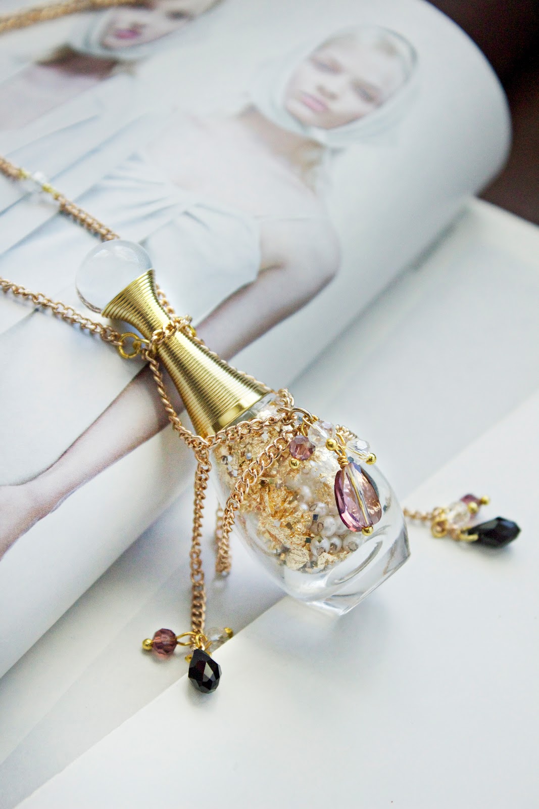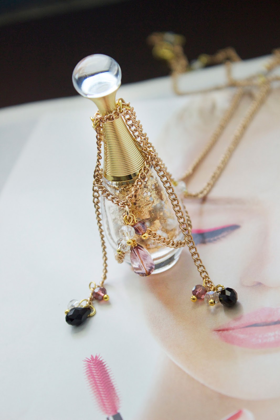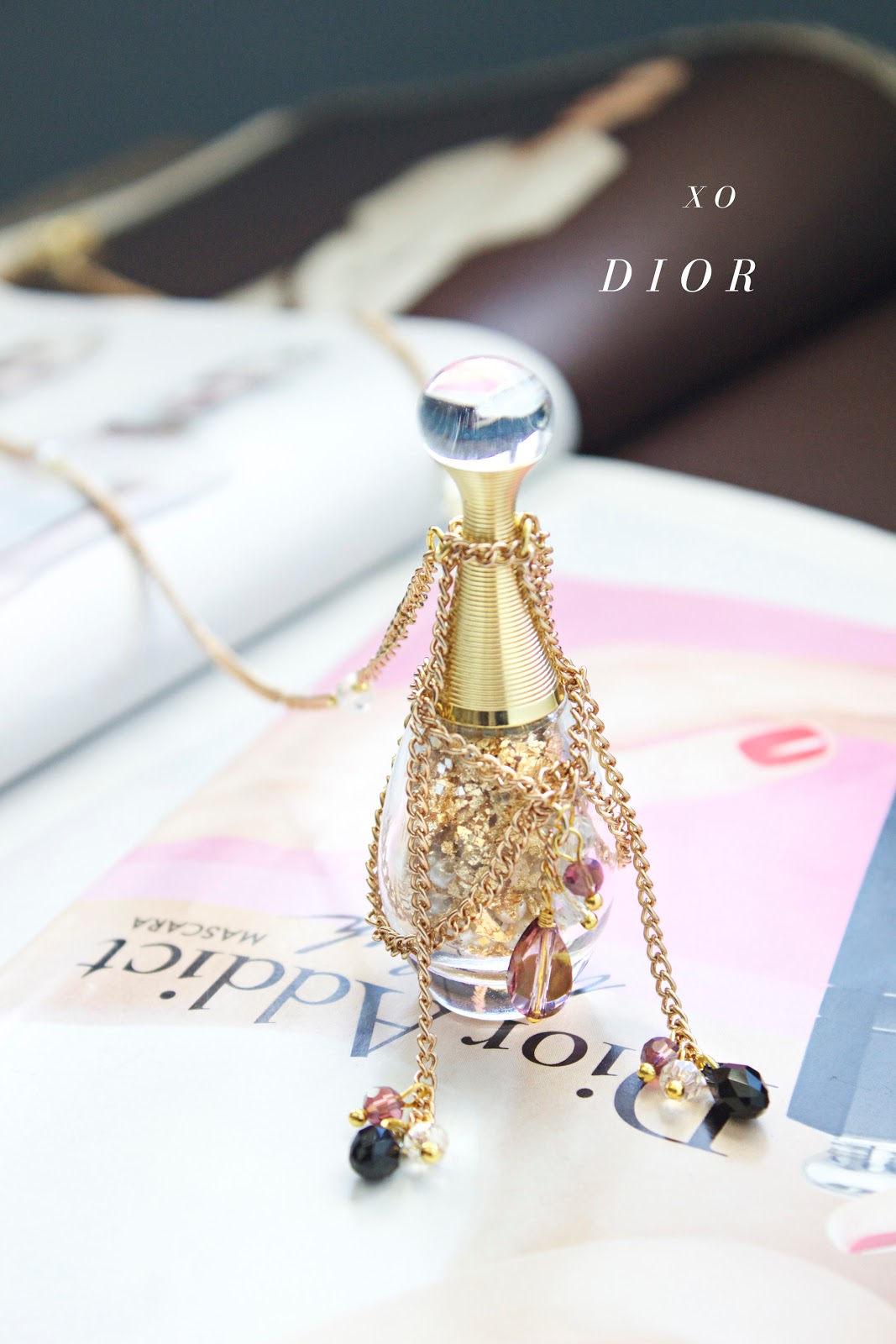 I adore Dior. With the same spirit as my other Chanel Potion Necklaces, this Dior Potion Bottle combines a luxury perfume bottle, crystals, gold flake, chain and more to create what I think is the ultimate form of recycling! This bottle was from a mini sample of Dior perfume- I knew this could not just go into the garbage, that it had another purpose.
