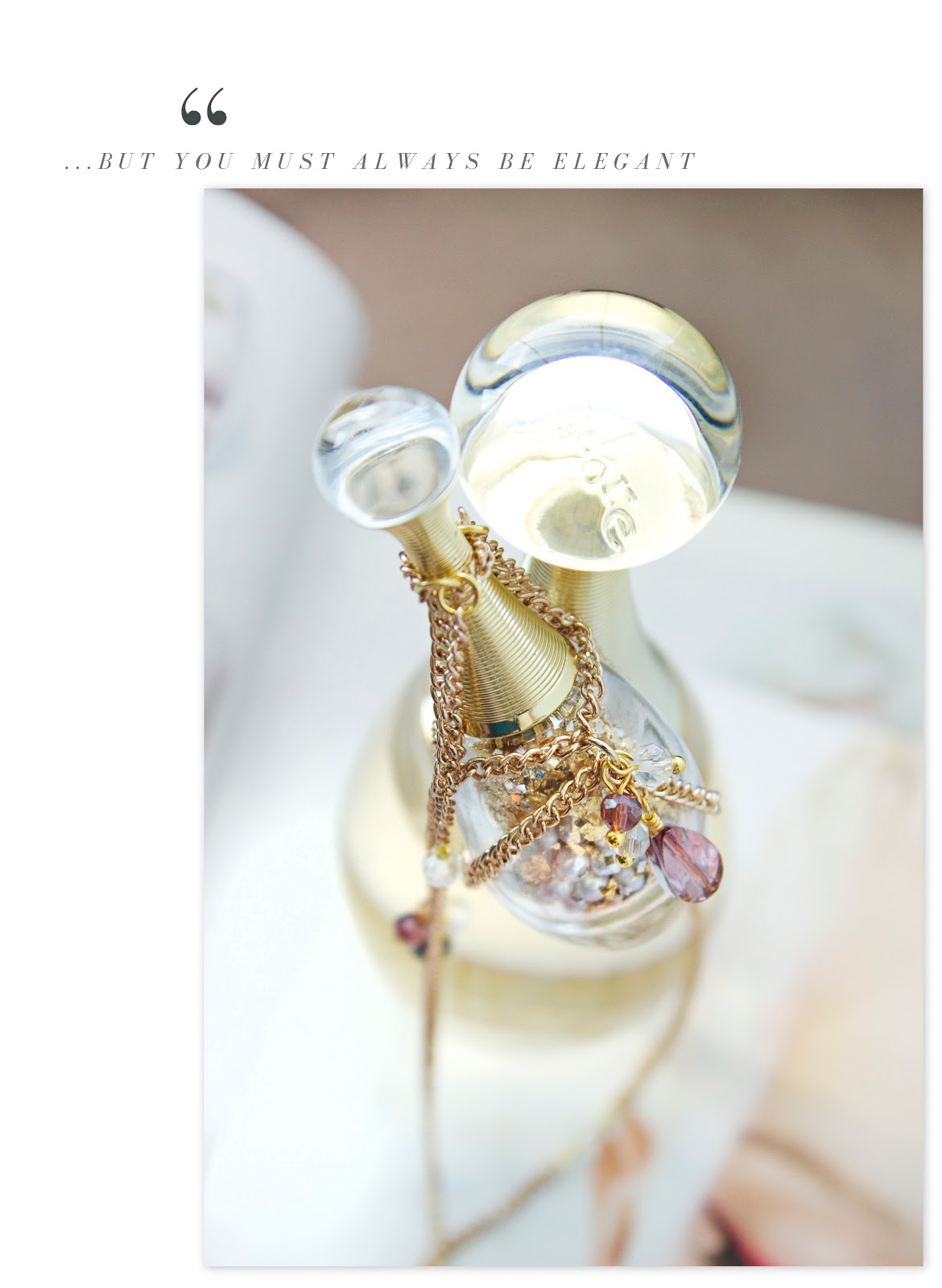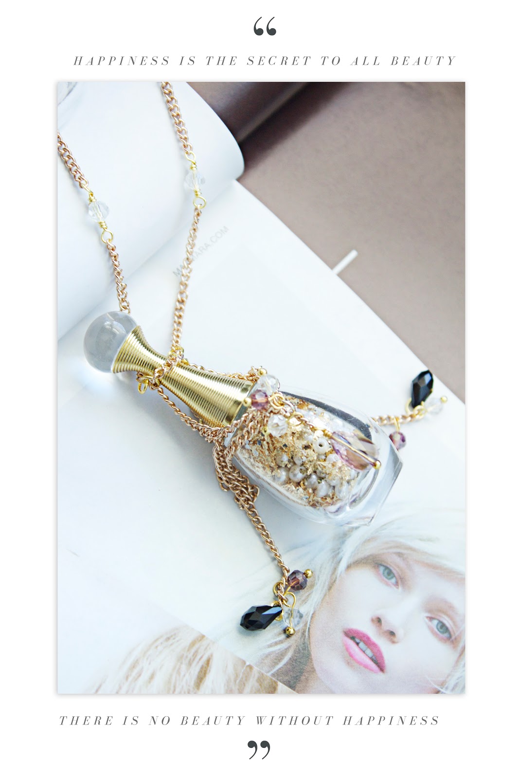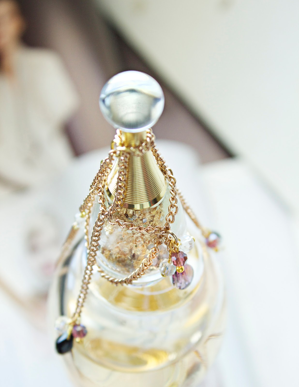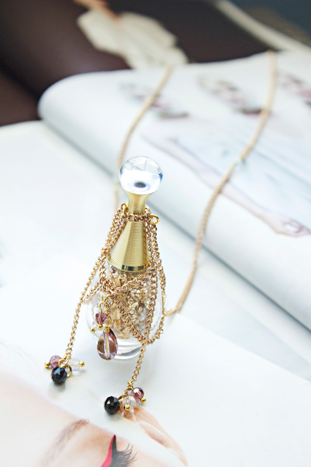I adore Dior. With the same spirit as my other Chanel Potion Necklaces, this Dior Potion Bottle combines a luxury perfume bottle, crystals, gold flake, chain and more to create what I think is the ultimate form of recycling! This bottle was from a mini sample of Dior perfume- I knew this could not just go into the garbage, that it had another purpose.